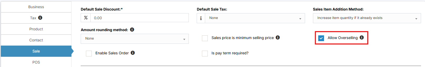 In some cases, the products need to be sold even when they are out of stock. In such cases, you can enable the “Allow Overselling” Option from the Business Settings > Sale.