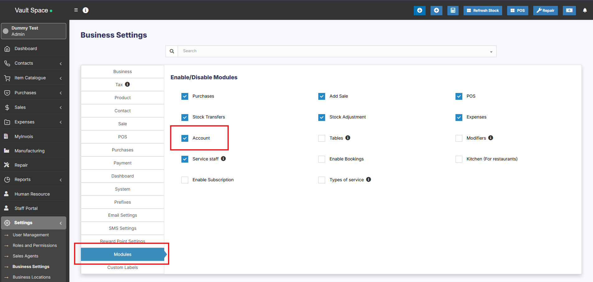 - Account type: to add an account type click on Add button and enter the name of the account type and submit. Keep the Parent account type unselected.