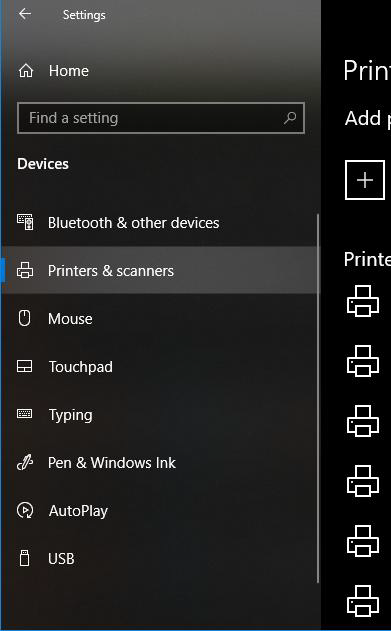 - Next, go to the Settings menu in Windows 10, select Devices and select Printers & Scanners on the left-hand menu.