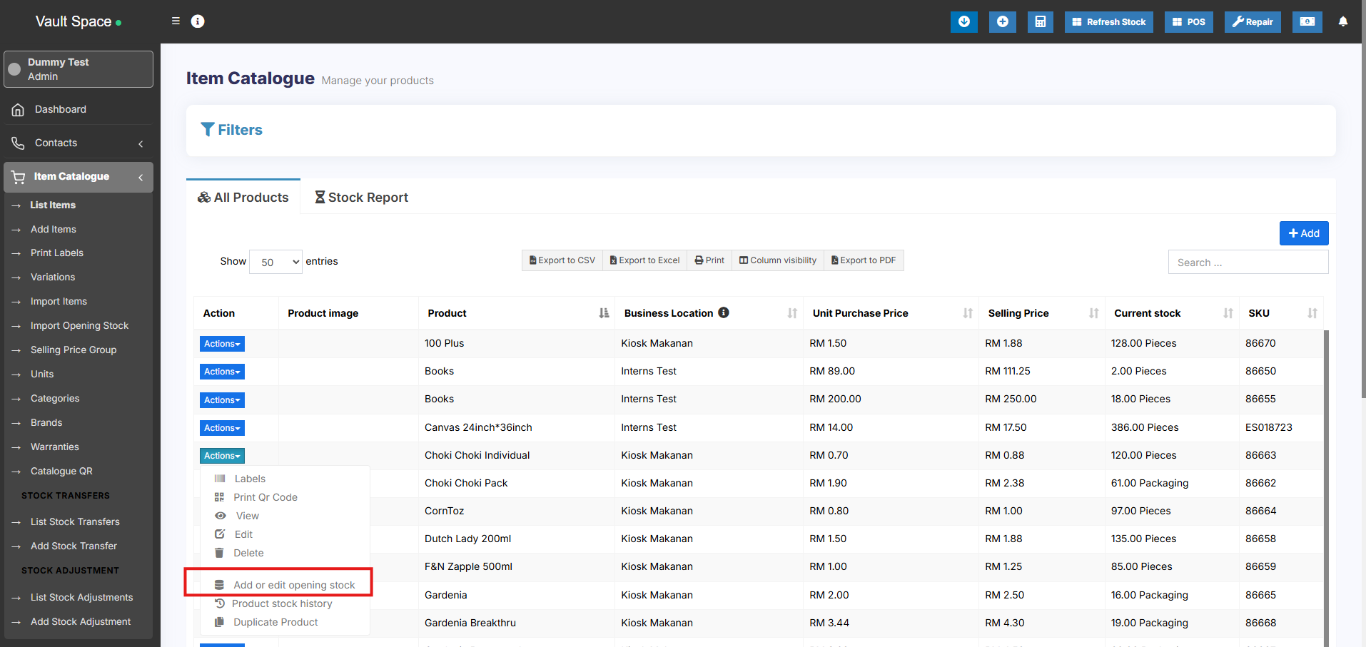 - Actions > Add or Edit Opening Stock