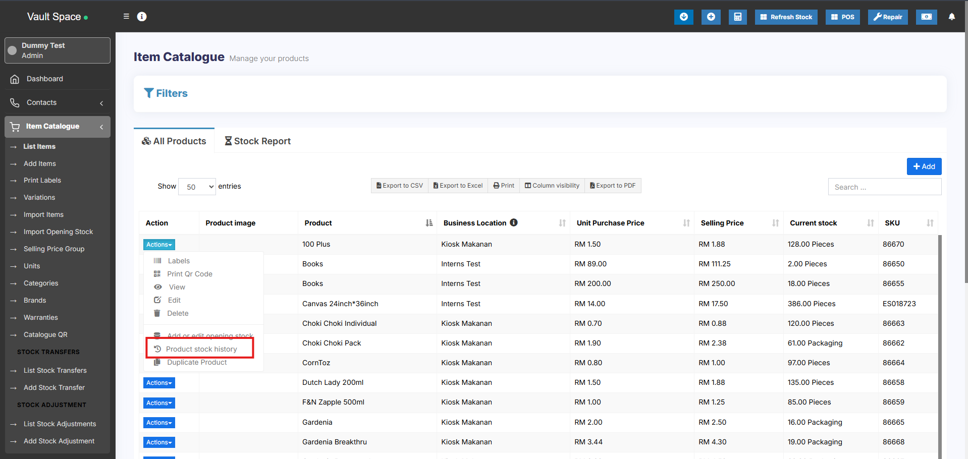 The Product Stock History feature allows you to view detailed records of all stock-related transactions for a specific product, including: