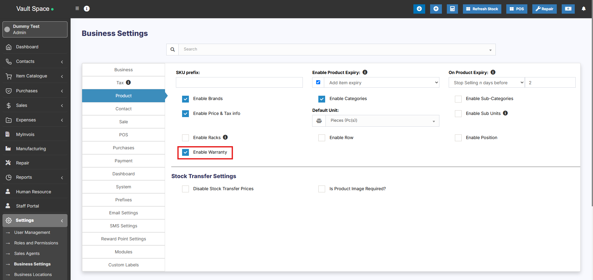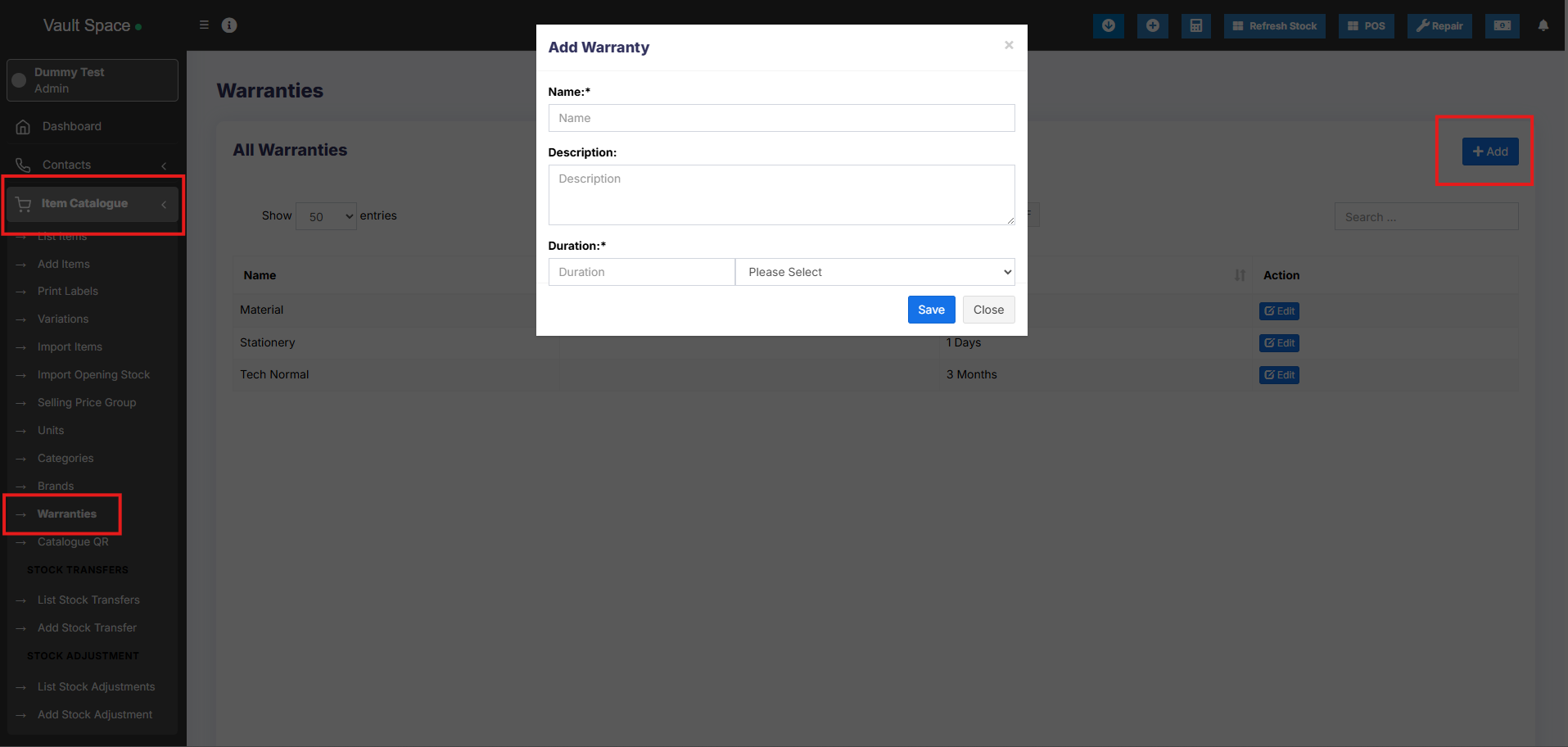 - Adding Warranty: Add warranty types by going to Products -> Warranty.