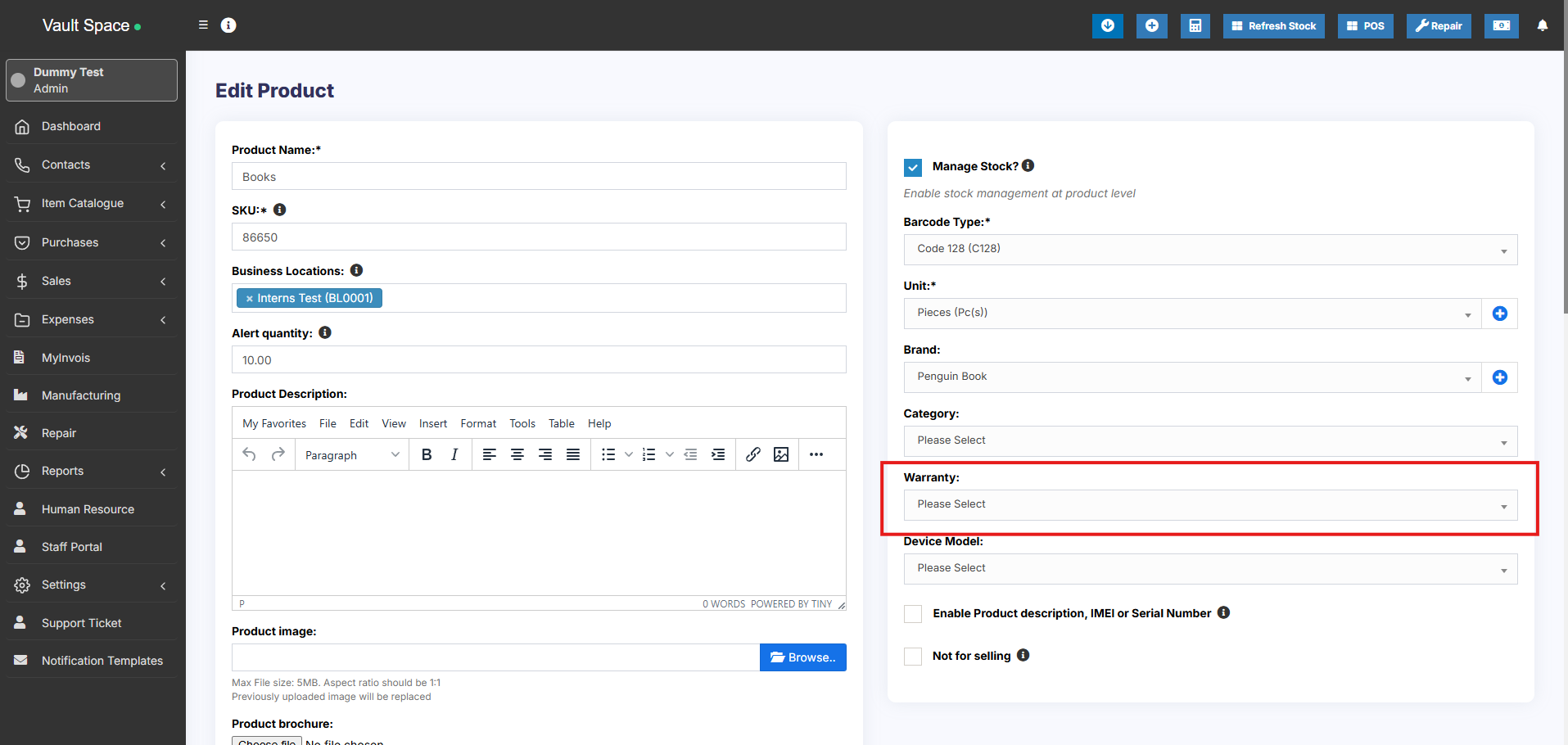 - Assigining warranty for products: Go to Add/Edit product and select the warranty that is applicable for the product.