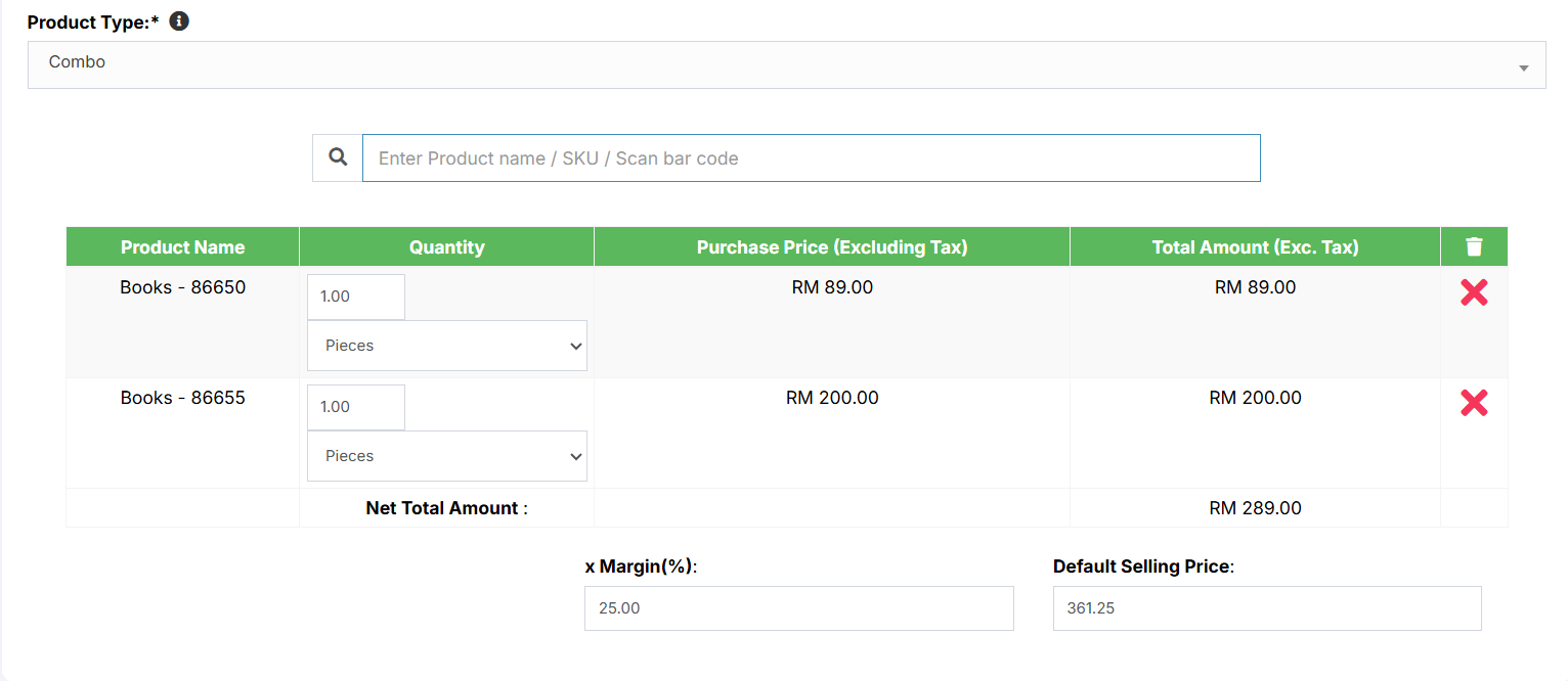 - Select the required products that are to be sold as a combo and add the required quantity for each product. Now save it