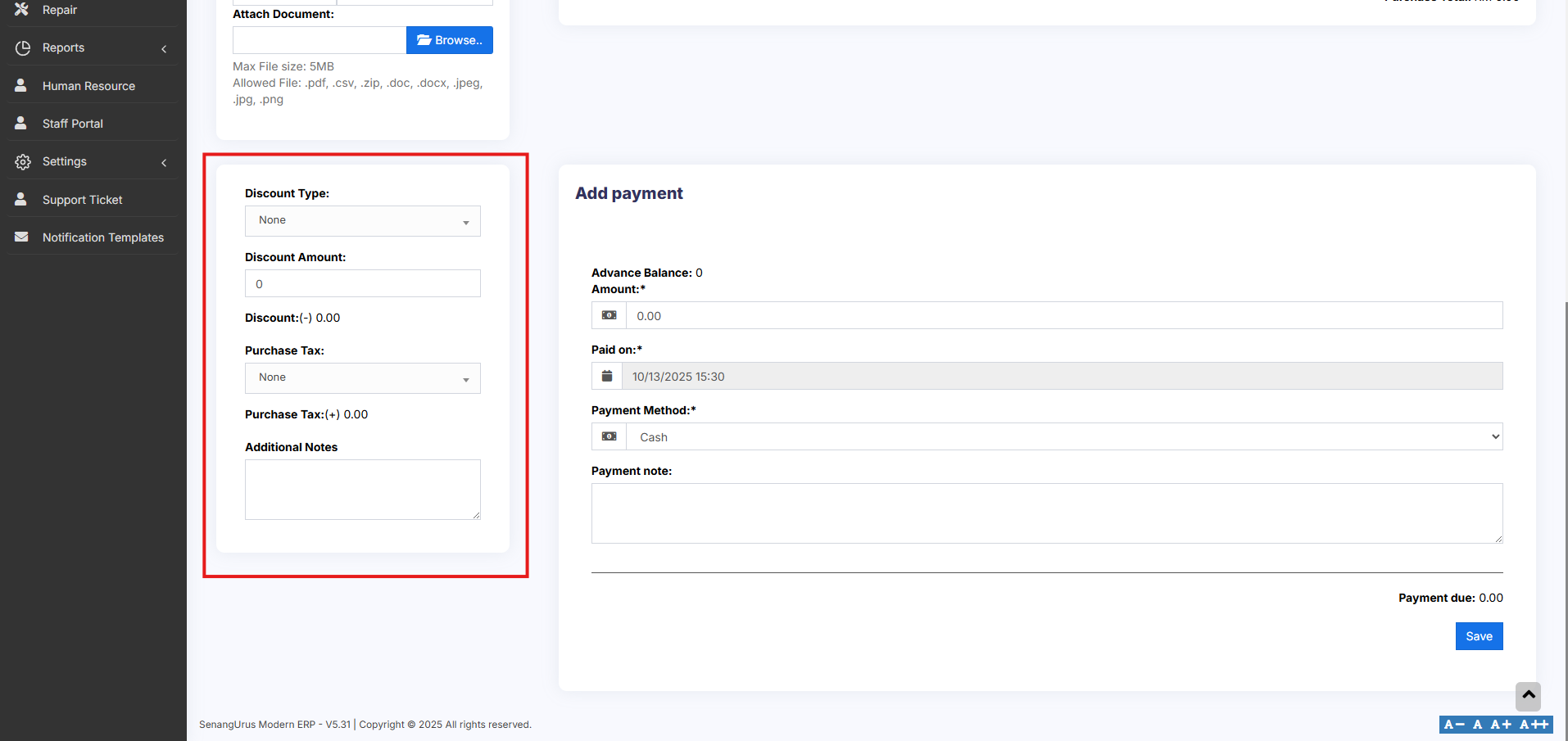 - To add a discount: Select the discount type (fixed or percentage) and enter the amount. ultimatePOS will auto-calculate the amount after discount.