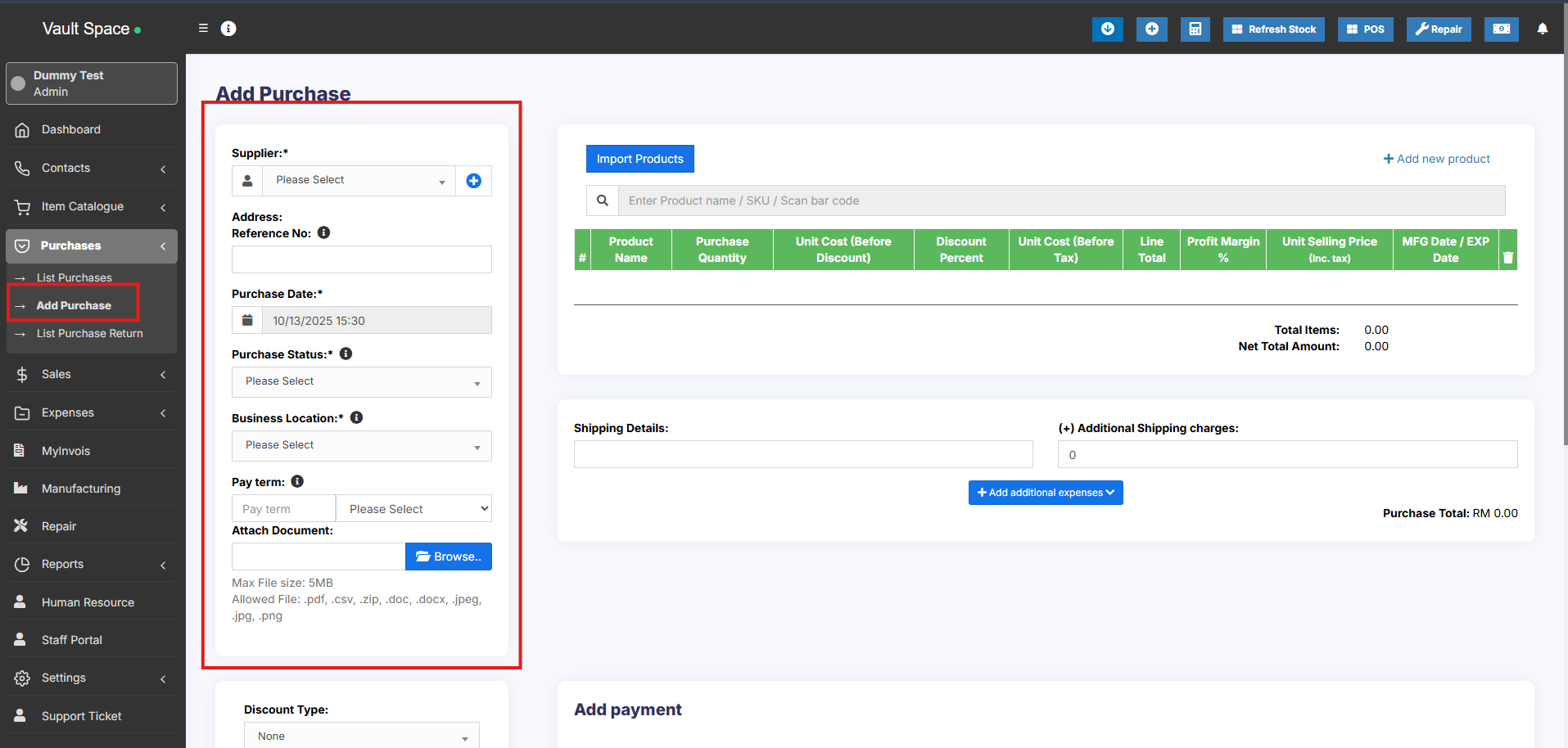 - Select Business Location: Select a location where you want to add the purchase. You can add a new Location from Settings -> Business Locations.