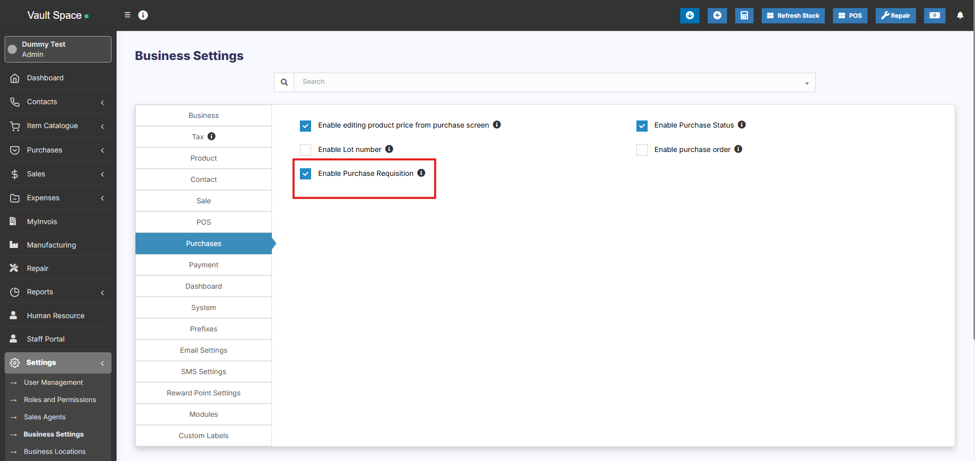 Go to Settings -> Business Settings -> Purchase and enable the purchase requisition check box.