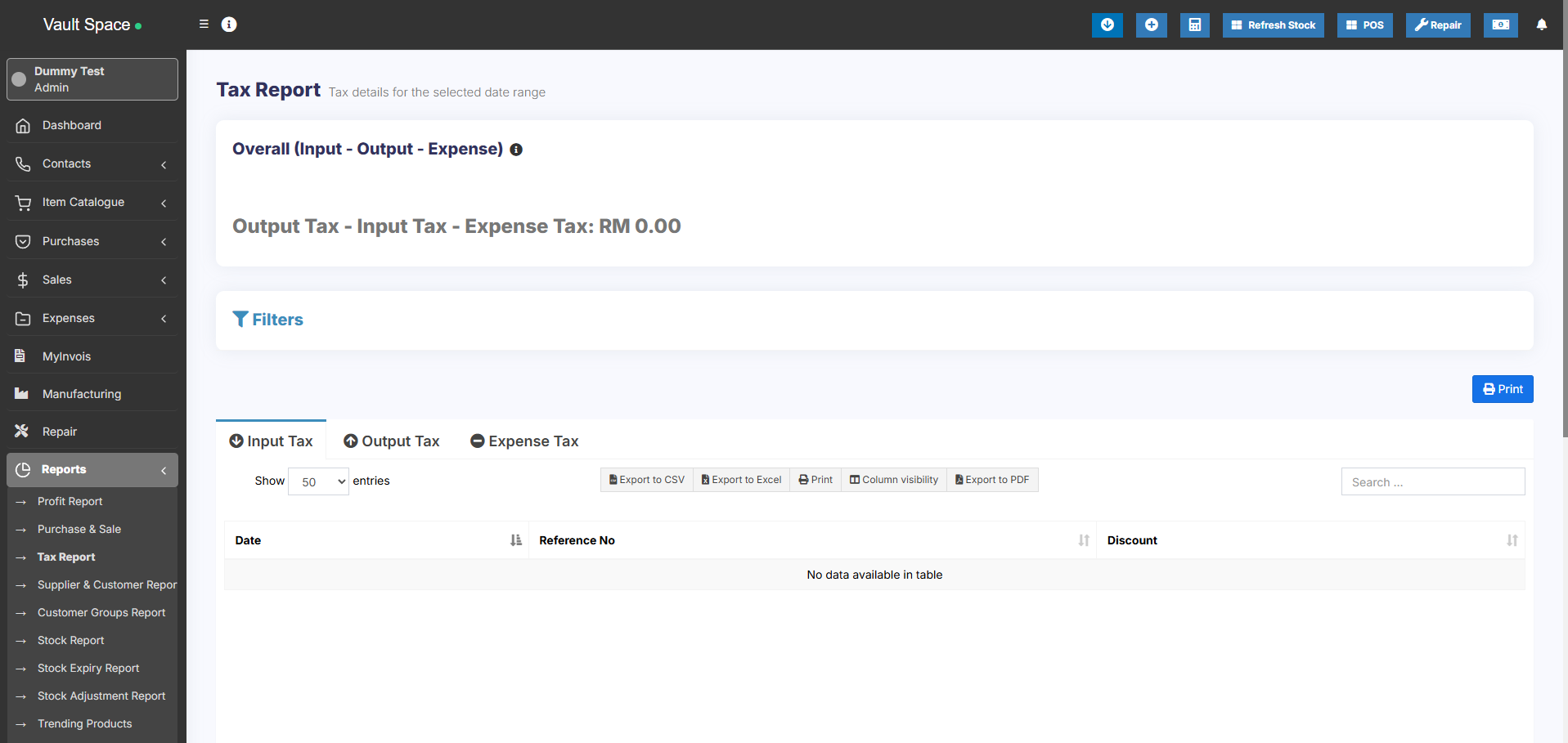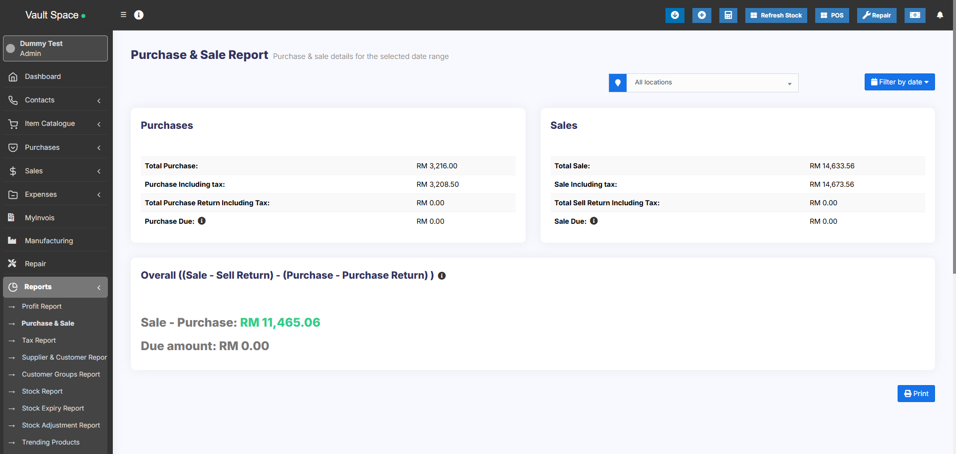 This report shows the total purchase, Purchase Including tax, Purchases with Dues amount; and Total Sale, Sale Including tax, Sale Due.