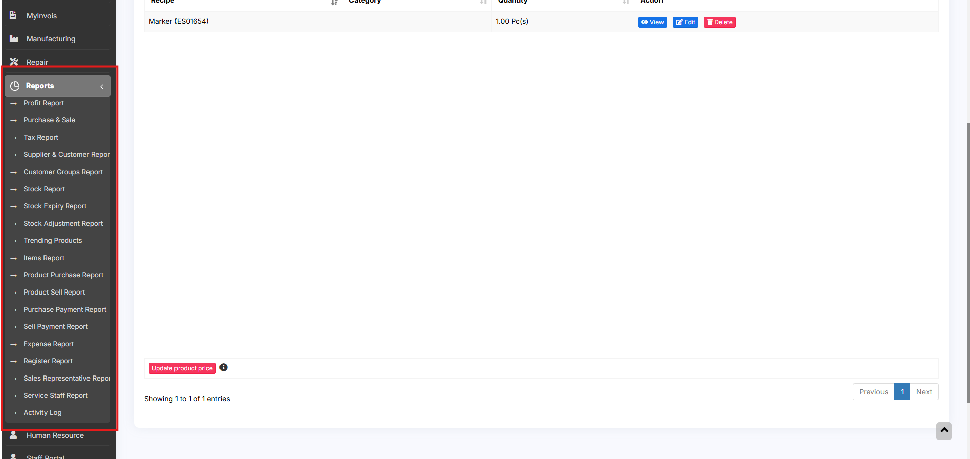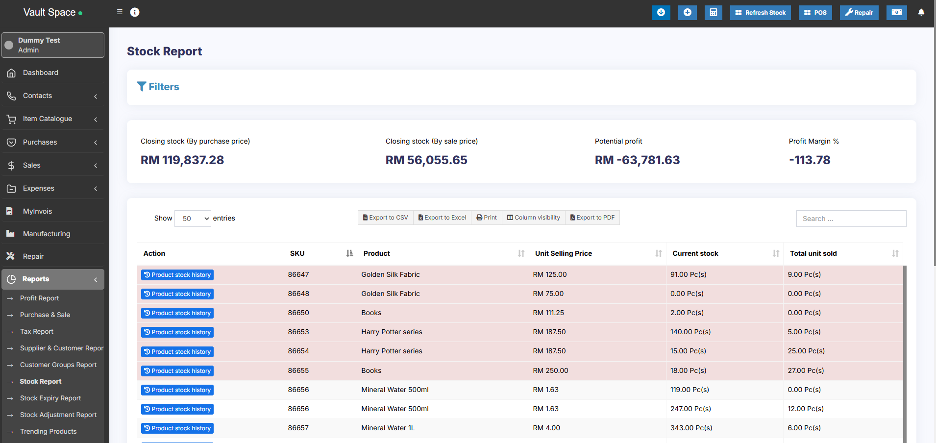 The stock report displays the stock details. With this, you can track the remaining stock and total sold quantity sold for all products.