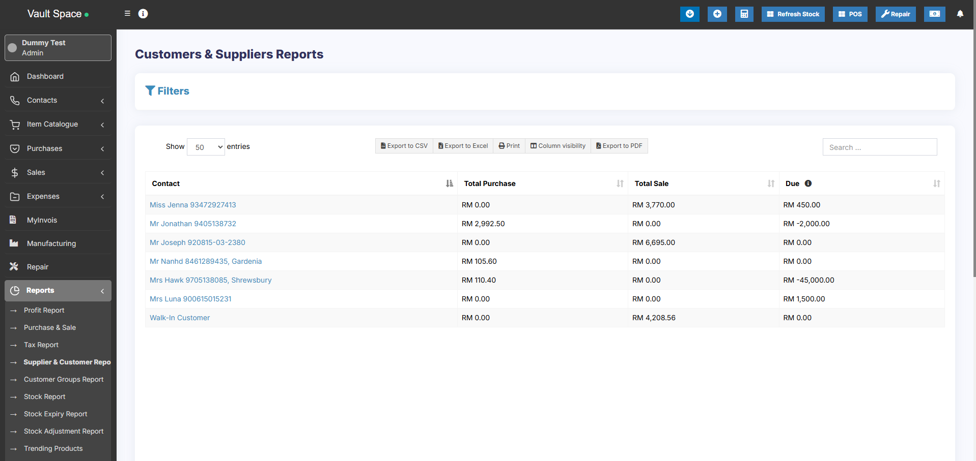 This report shows the details of Purchase & Sell with all contacts (Suppliers & Customers) and also any Due amount. Positive Due amount indicates payment by contact, negative indicates payments to the contact.