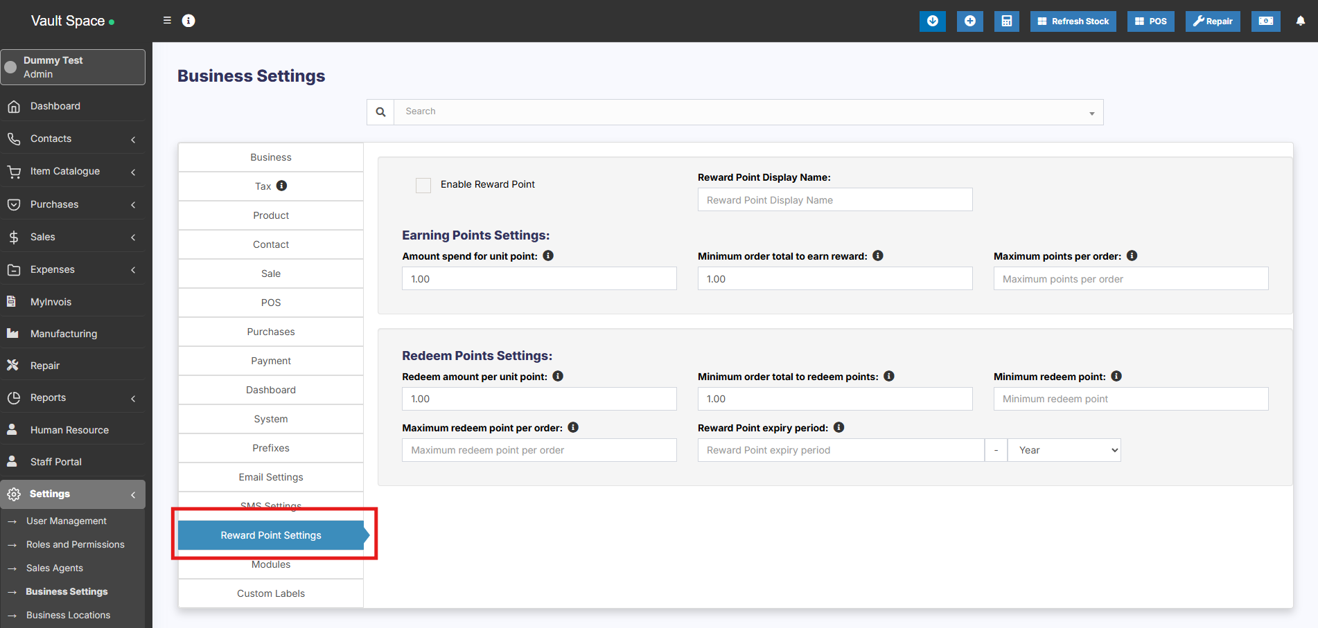 - Go to Settings -> Business Settings -> Reward Points Settings.