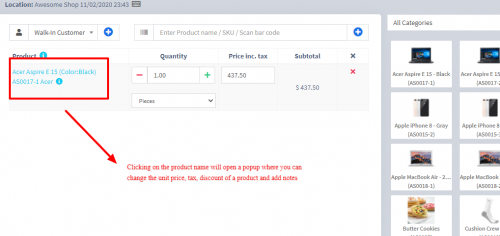 - After the products get added, click on the product name to modify product price, tax & discounts.