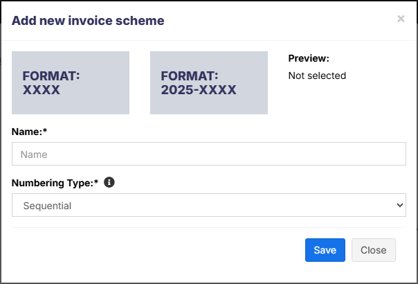 Format can be XXXX or <year>-XXXX - You can also provide a custom prefix, invoice start number, number of digits in the invoice number.