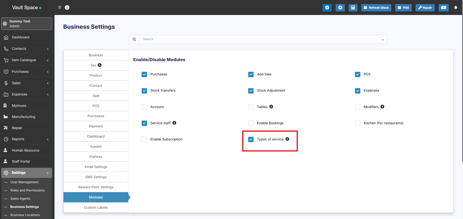 Go to Settings -> Business Settings -> Modules -> Check the “Types of Service”