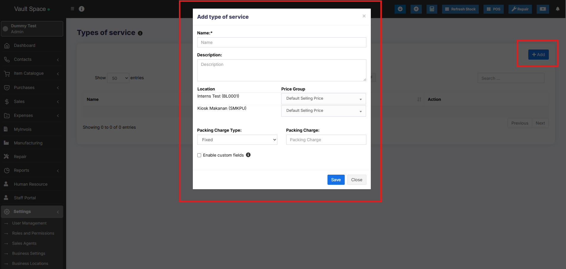 - Enable custom field: this will enable some custom fields in type of service in POS screen.