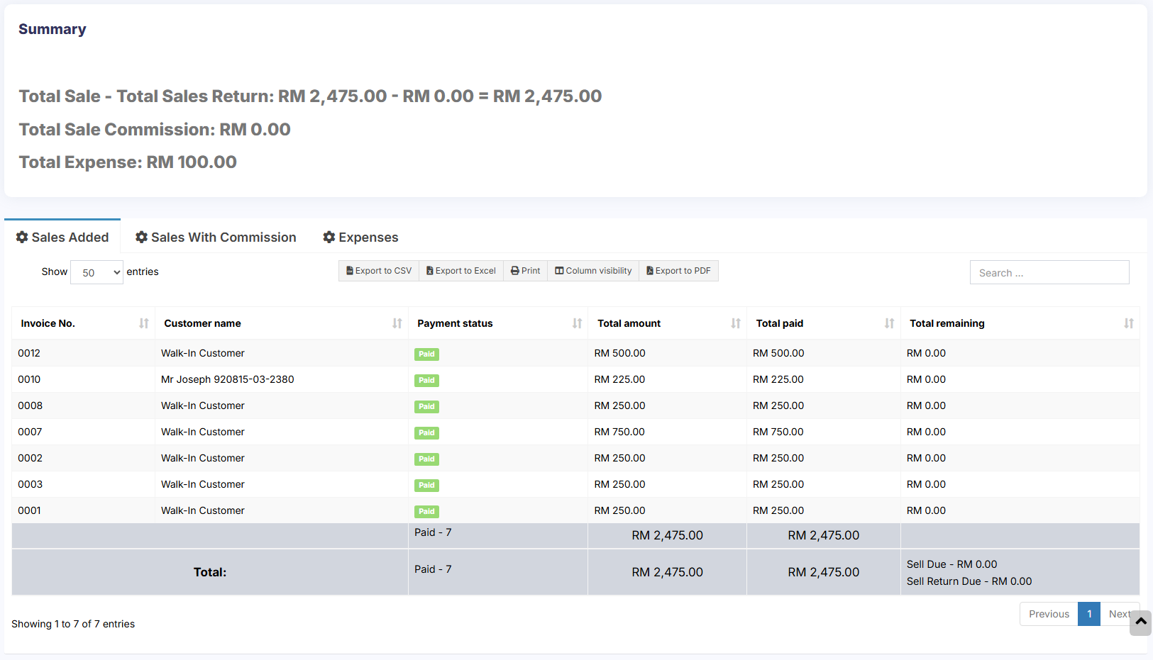 On selecting it will show you the detailed summary of Total Sale, Total Sale Commission & Total Expense. Also, the table below lists all the transactions.