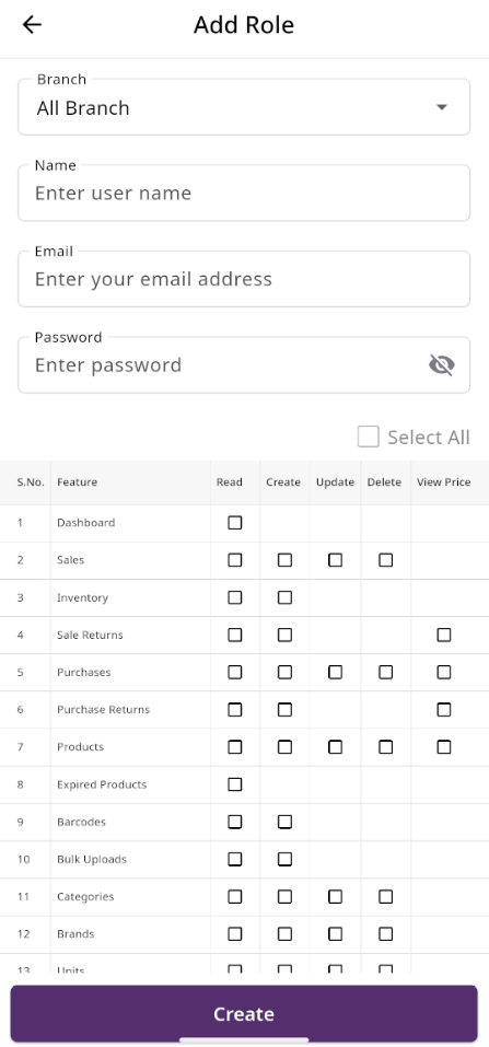 After clicking on "Add User Role," you will be redirected to the create page, where you need to fill in the required information. Once completed, click the "Create" button. The new user role will be created successfully, and you will be redirected back to the user role list. If you are not under any branch, a new field will appear where you can select the branch for which you want to assign the role and permissions.