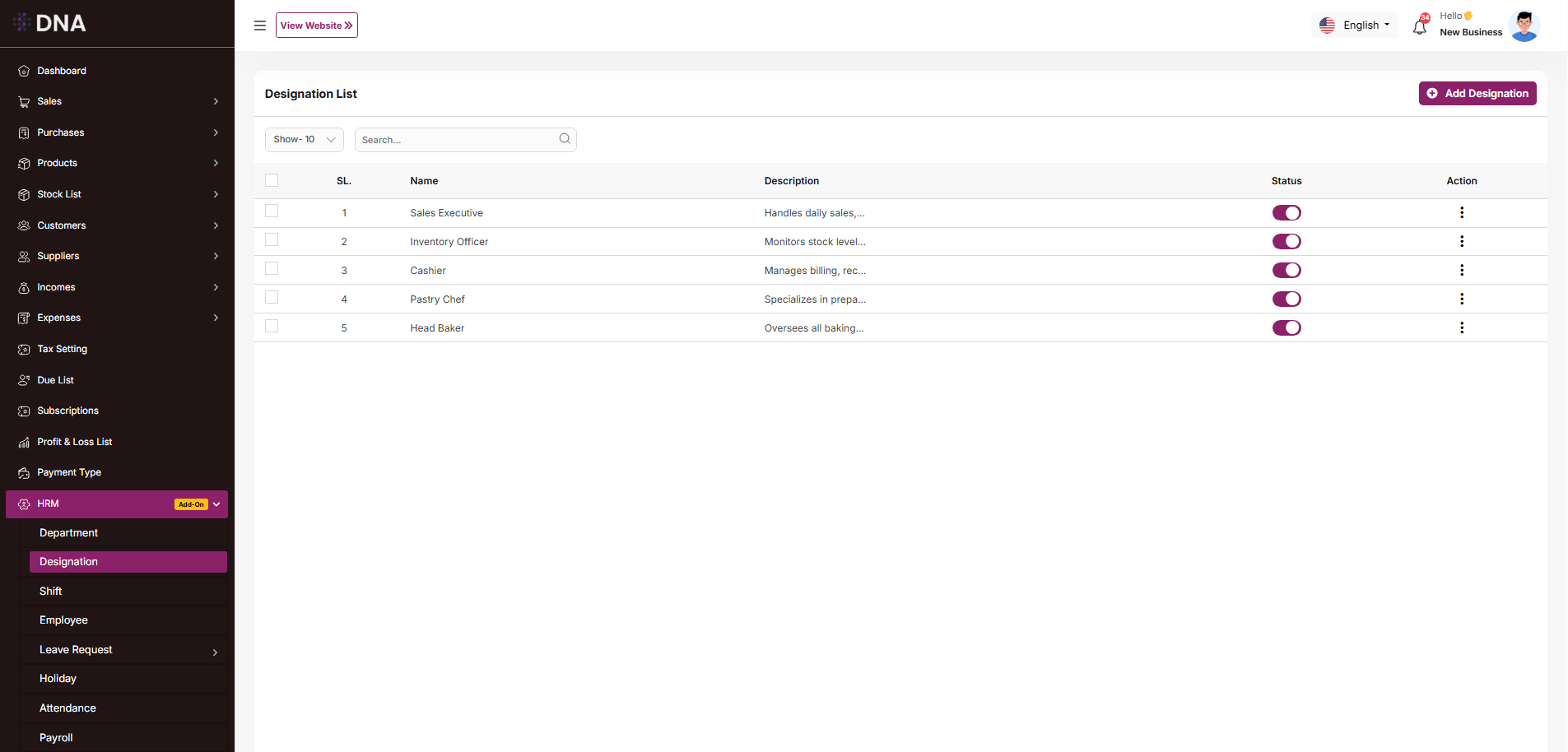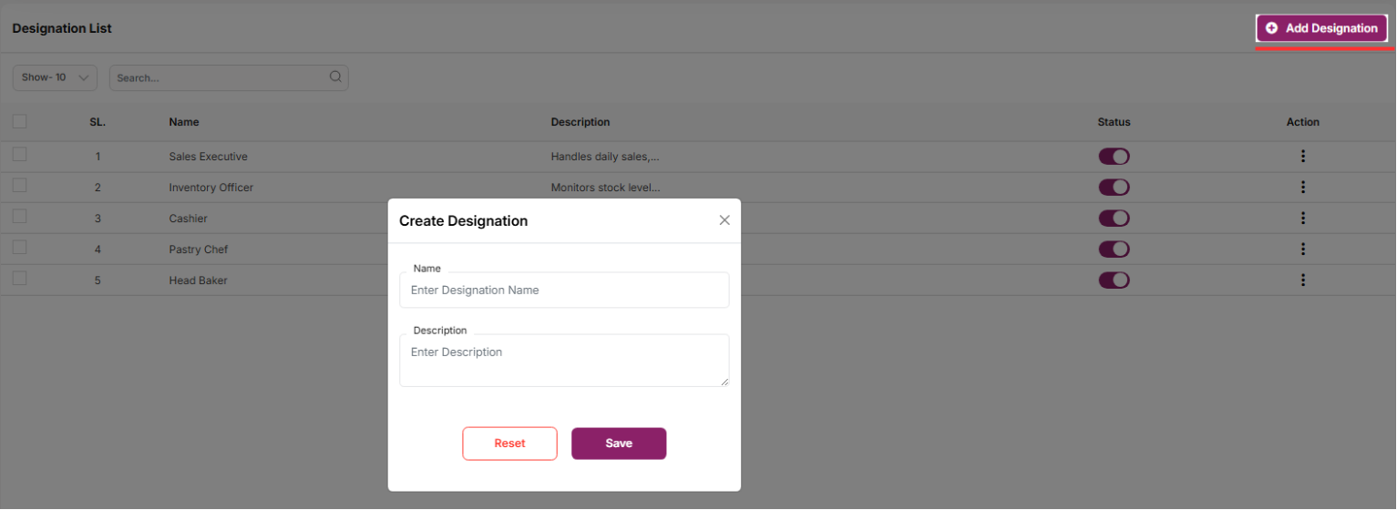Use the search bar to find specific designations by name or description.Click the "Add New designation" button to navigate to a page or modal where you can add a new designation.Clicking the three dots in the "Action" where you can edit,delete and view.