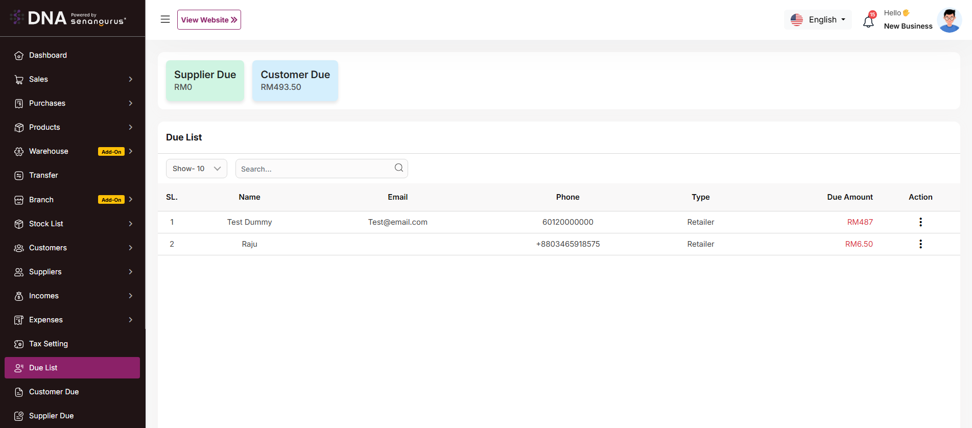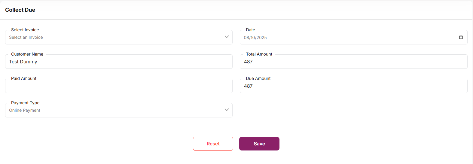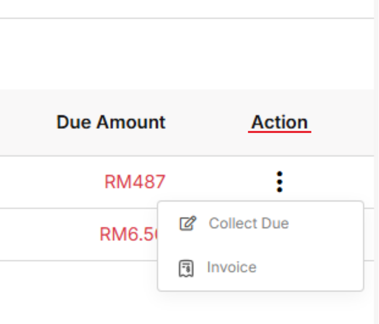 Here, you can view the Due list with a search filter. Additionally, you can view invoices and collect the due amounts from this page.