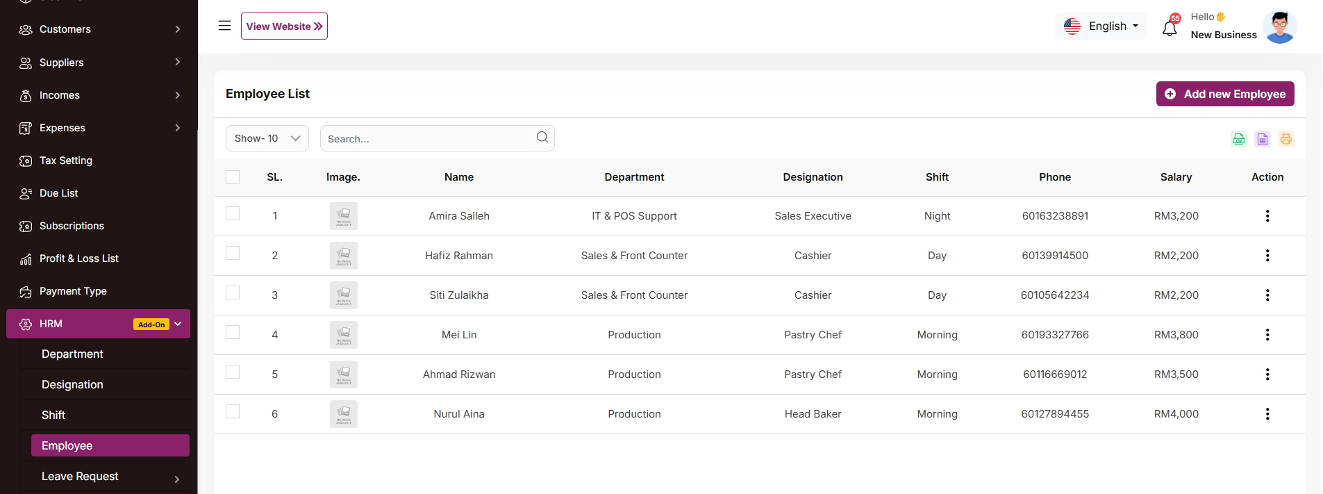 Use the search bar to find specific employees by name, employee ID, designation, or other relevant criteria. Click the "Add New Employee" button to navigate to a page or modal where you can add a new employee record. Clicking the three dots in the "Action" where you can perform edit, delete and view.