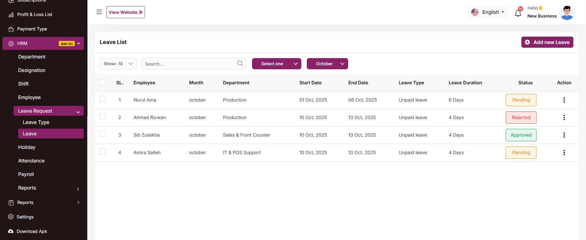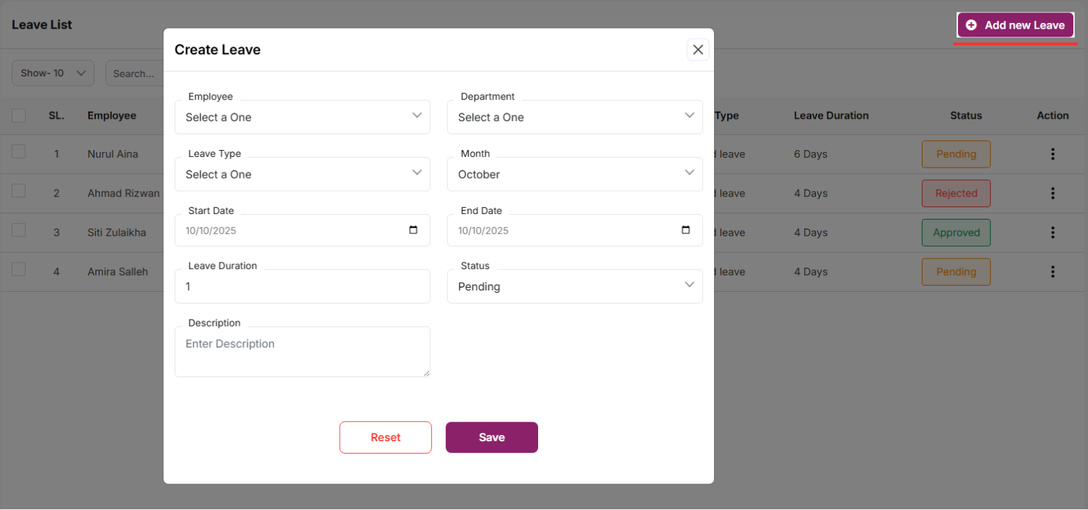 Use the search bar to find specific leave requests by employee ID, name, leave type, or other relevant criteria. Click the "Add Now Leave" button to navigate to a page where you can add a new leave request. Clicking the three dots in the "Action" where you can edit, delete and view.