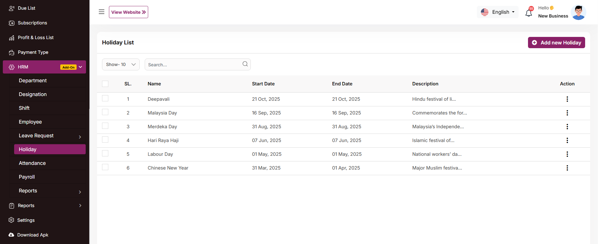The "Holiday List" page displays a list of defined holidays with their dates, names, and descriptions. It provides options to manage these holidays. Click the "Add New Holiday" button to navigate to a modal where you can add a new holiday to the system. Clicking the three dots in the "Action" where you can edit, delete and view for holiday.
