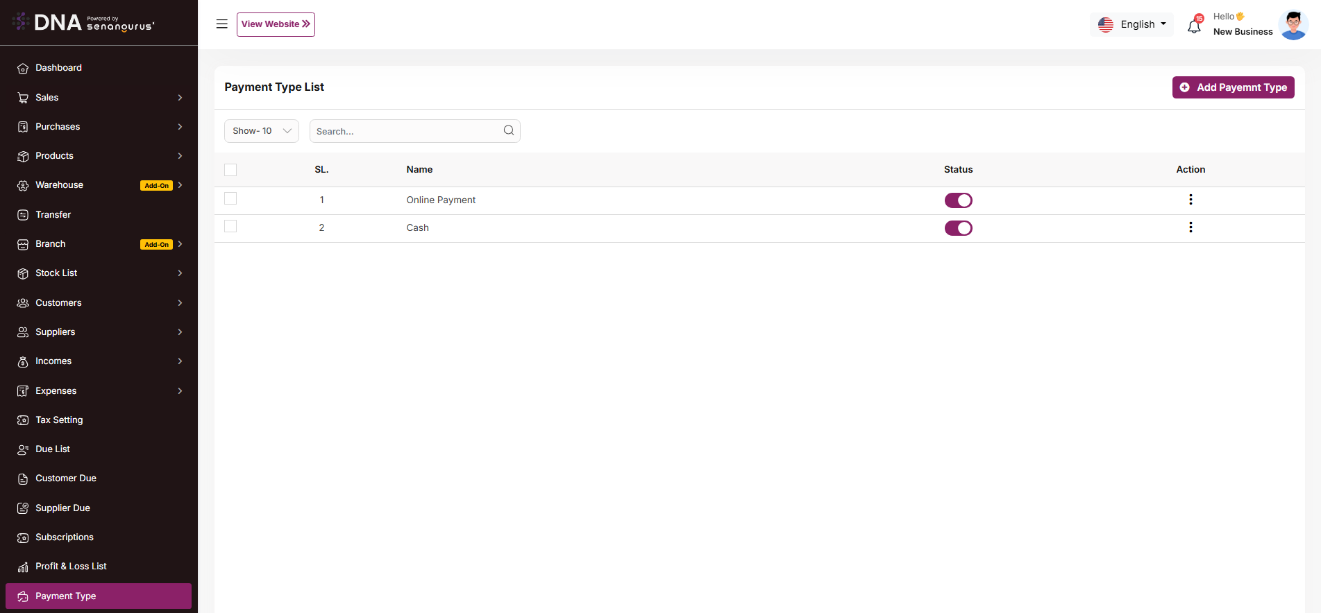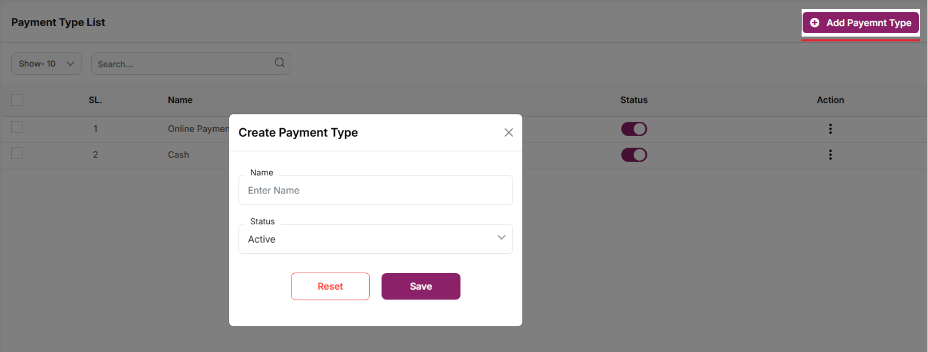 Here, you can view the list of payment types. The list can be filtered using the search input or the per-page filter. You can also update the status (active or inactive) by toggling the switch. Additionally, edit, delete, and multi-delete options are available.