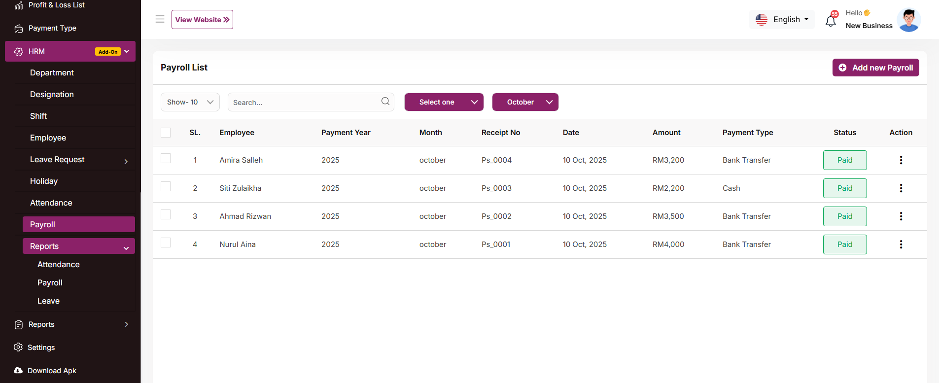 The Payroll List interface provides a comprehensive view of employee payroll transactions, enabling administrators to track payments, verify statuses, and manage records efficiently. This document outlines the key components, functionality, and observations from the displayed interface. Click the "Add New Payroll" button to navigate to a modal where you can add a new Payroll to the system. Clicking the three dots in the "Action" where you can edit, delete and view for Payroll.