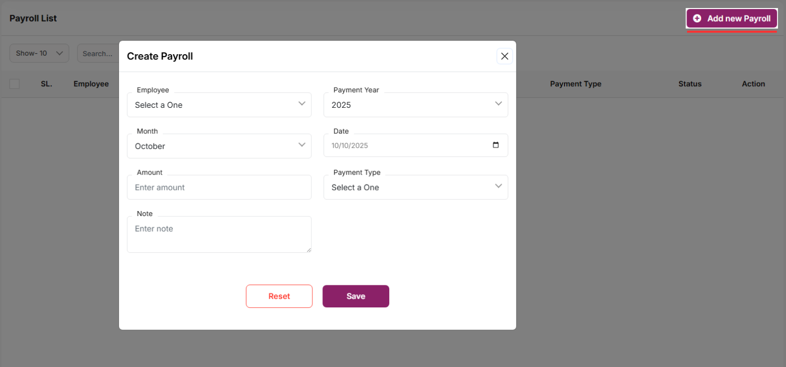 The "Add New Payroll" form appears as a pop-up or overlay on the "Payroll List" page. It contains filled the following input fields.