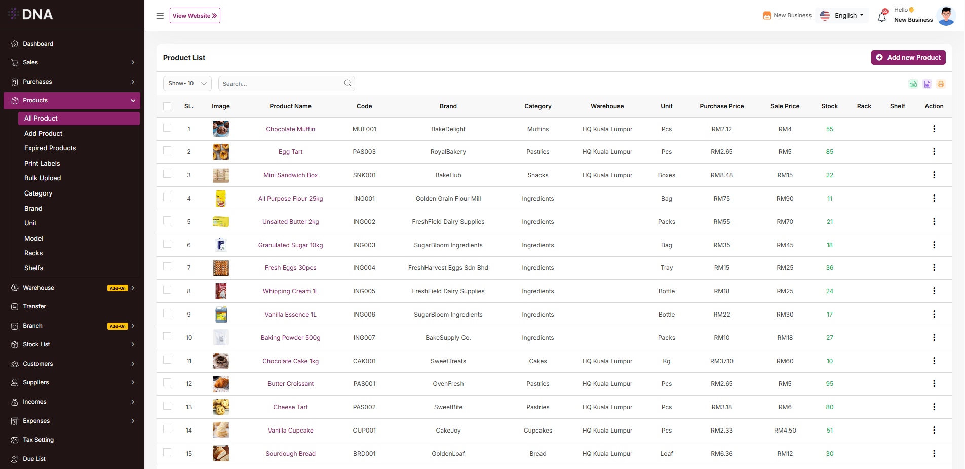 The product list in this table is specific to each warehouse. Only products belonging to the selected warehouse will be displayed.You can filter the list using the input field, and per-page filtering is also available. Clicking on a product name allows you to view the stock details for that product.