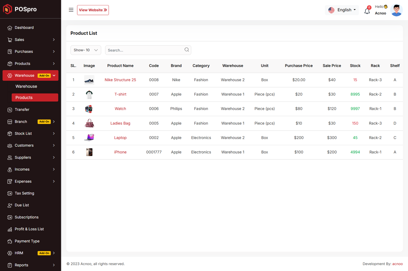 The product list in this table is specific to each warehouse. Only products belonging to the selected warehouse will be displayed.You can filter the list using the input field, and per-page filtering is also available. Clicking on a product name allows you to view the stock details for that product.