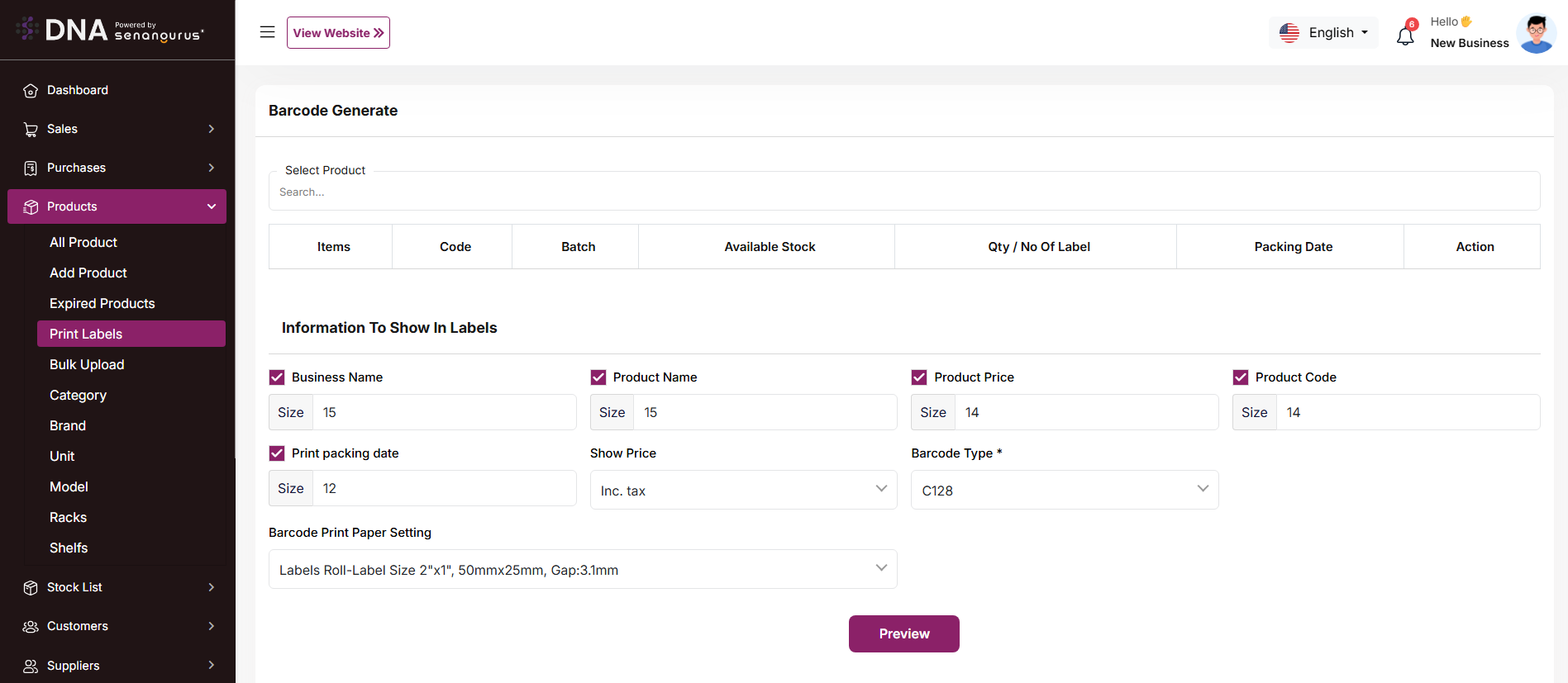 The Barcode Label Module in POS Pro allows users to generate and print barcode labels for selected products. Users can choose which information appears on the labels, including business name, product name, price, product code, packing date, and barcode. Each label uses the size defined for the product, and paper settings can be adjusted to ensure proper printing. Users can preview labels before printing to verify layout and content.
