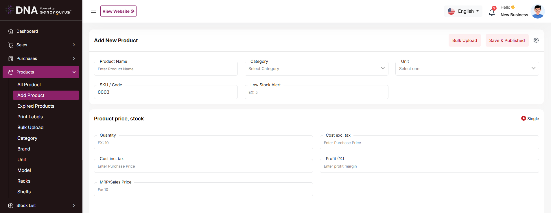 You can create a product by filling in the required fields. When you select a Product Category, the associated variation fields (such as capacity, color, size, type, or weight) linked to that category will appear. You can then provide the necessary variations. The Product Code field will suggest a code by default, but you can update it if needed. Ensure you carefully input the product price. If everything is correct, click the save button to store the product.