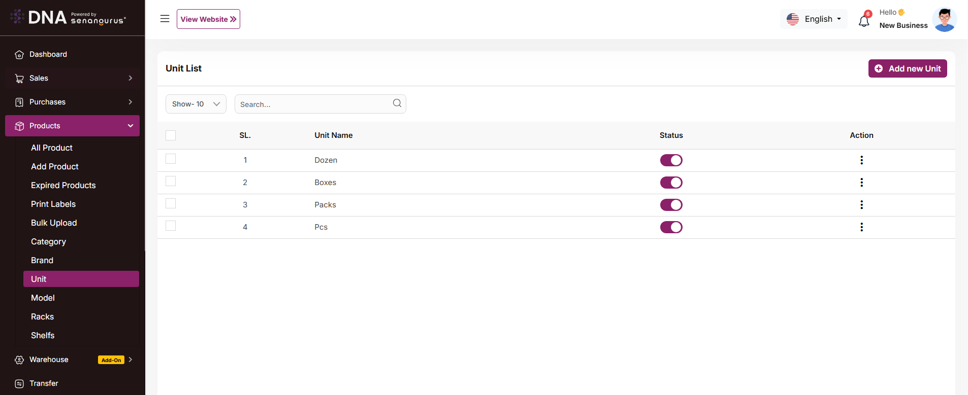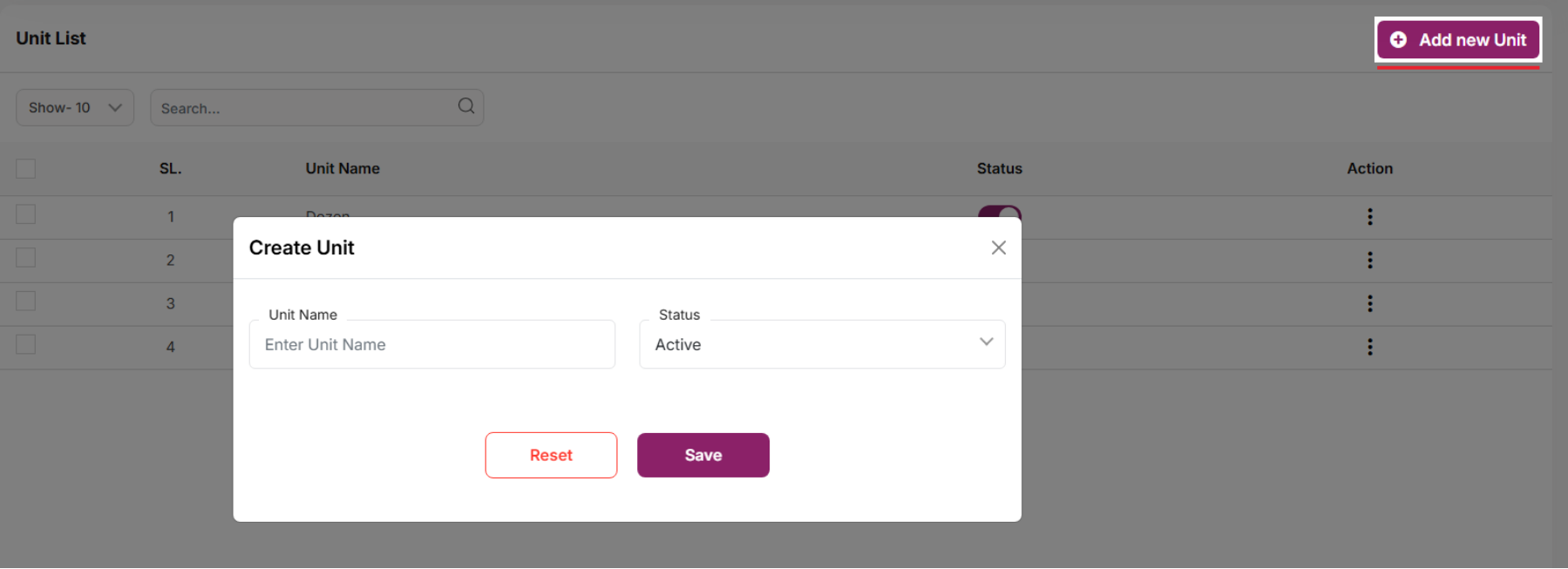 You can view the Unit list with available filtering options. Furthermore, you have the ability to edit, delete, or use the multi-delete function.