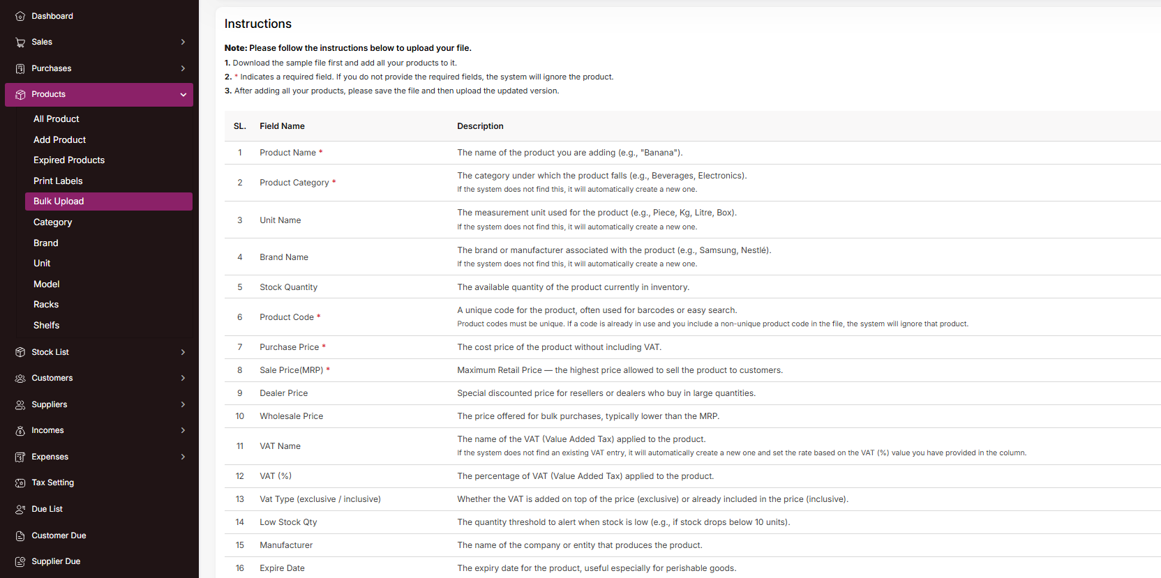 From the **Bulk Upload** module, users can upload a list of products in bulk. You can download a demo Excel file by clicking the download file button. This file contains all the columns that need to be filled, and columns marked with an asterisk (*) indicate mandatory fields. After completing the file, use the **Choose File** option to select your edited file for bulk upload, then click the **Submit** button. All roles, conditions, and instructions are illustrated in the image below for better understanding.