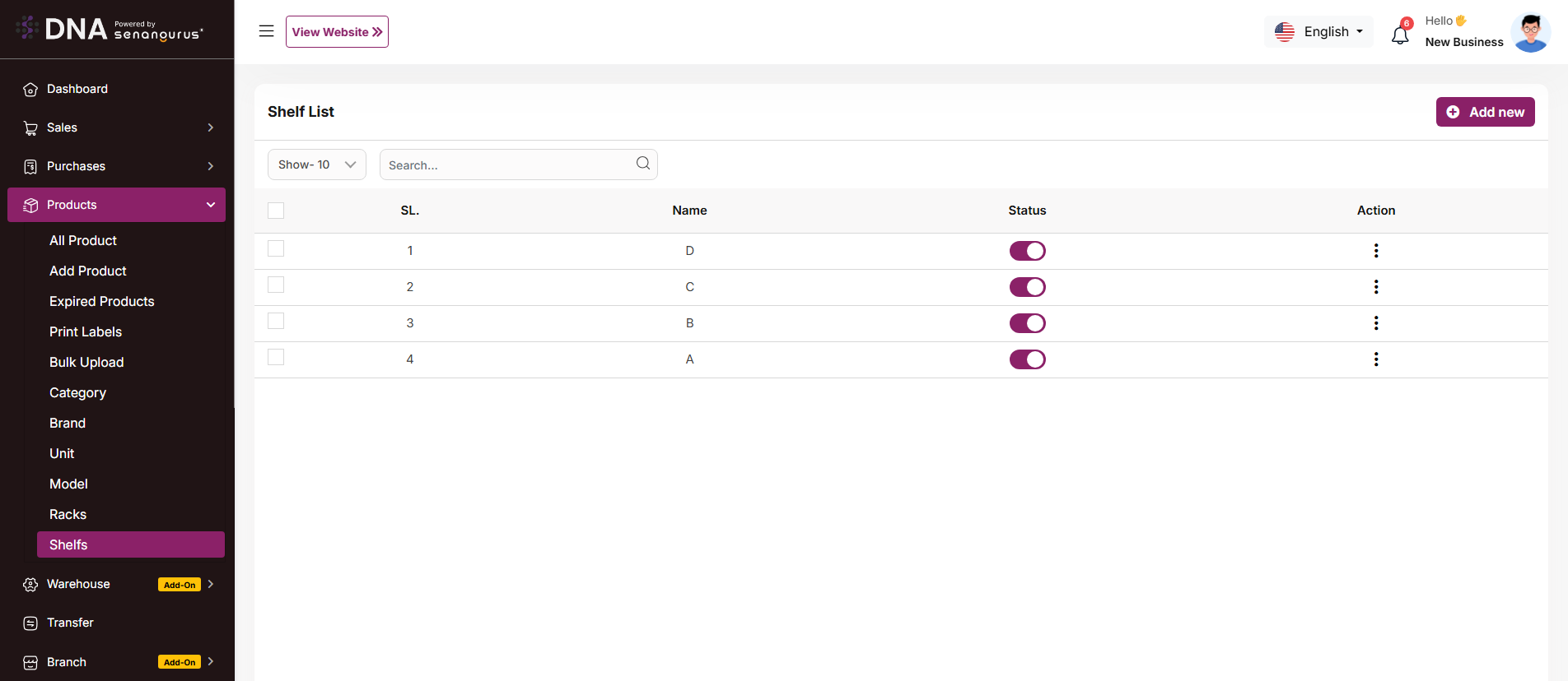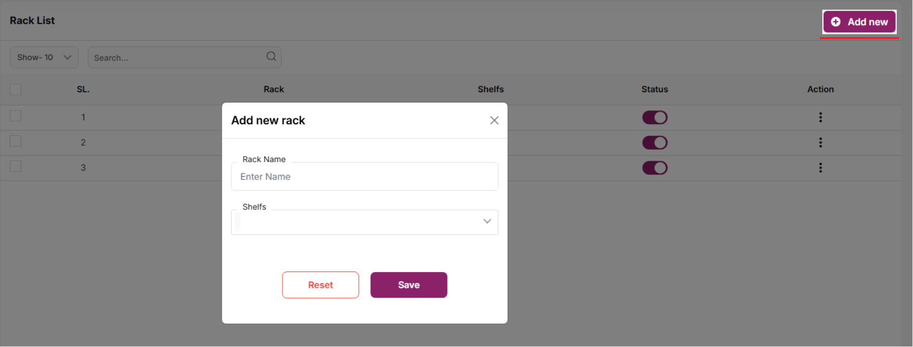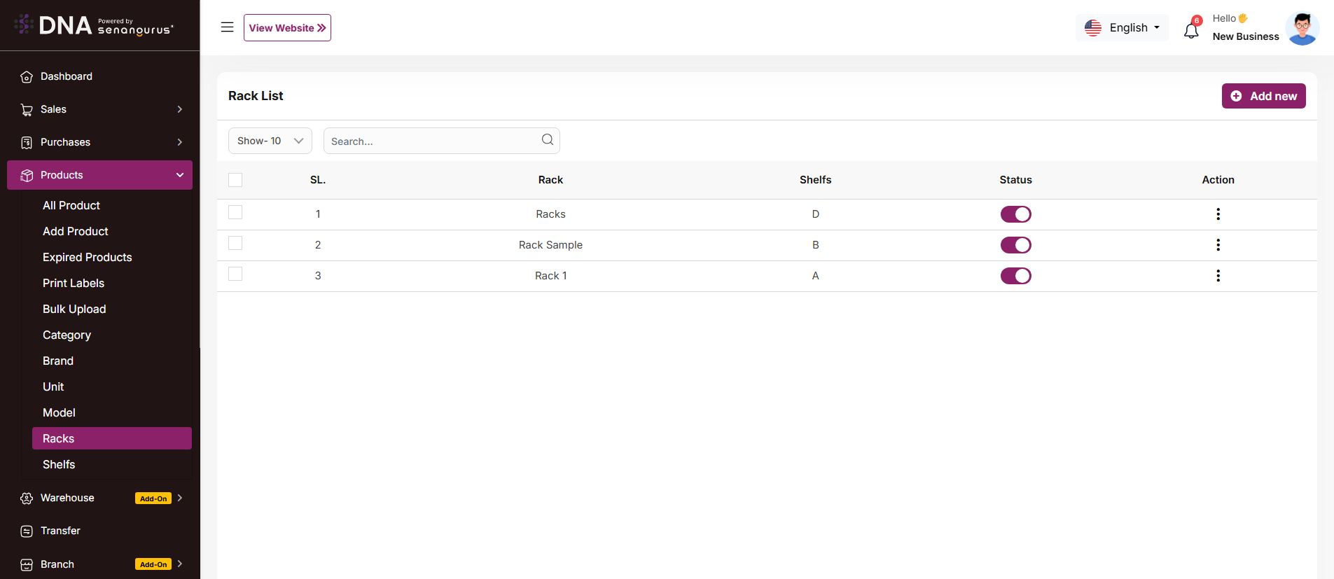 You can view the rack list with available filtering options. Furthermore, you have the ability to edit, delete, or use the multi-delete function.
