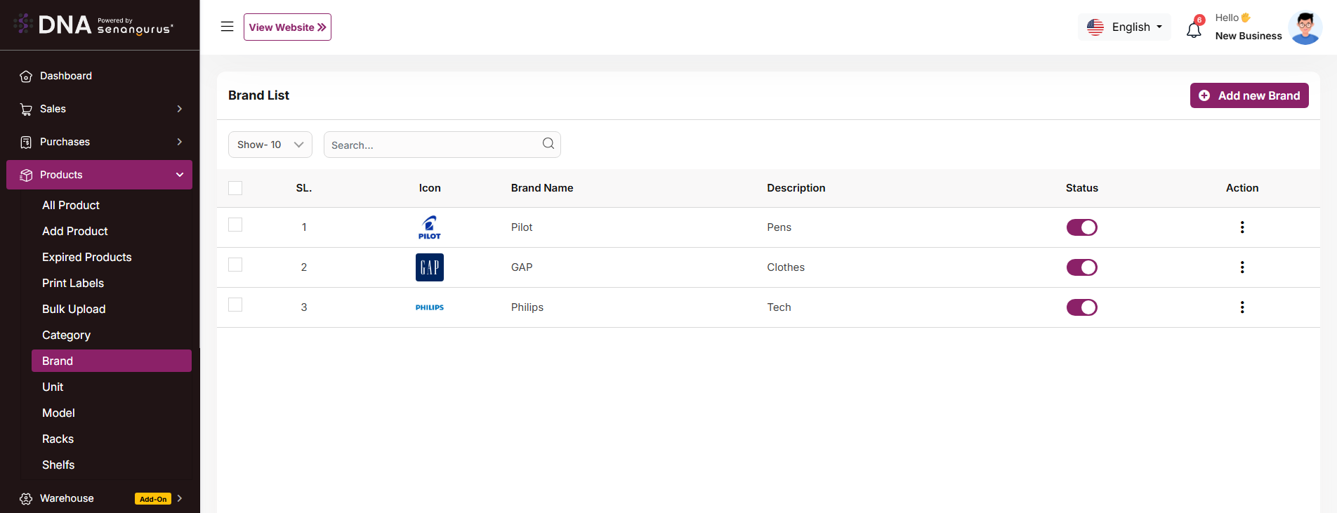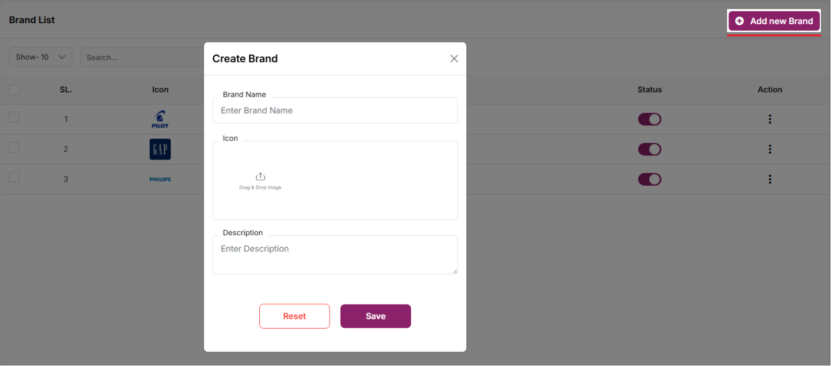 You can view the Brand list with available filtering options. Furthermore, you have the ability to edit, delete, or use the multi-delete function.
