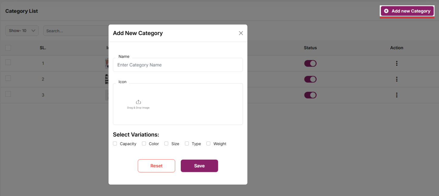 You can create a Category by filling in the required fields and selecting the desired variation.