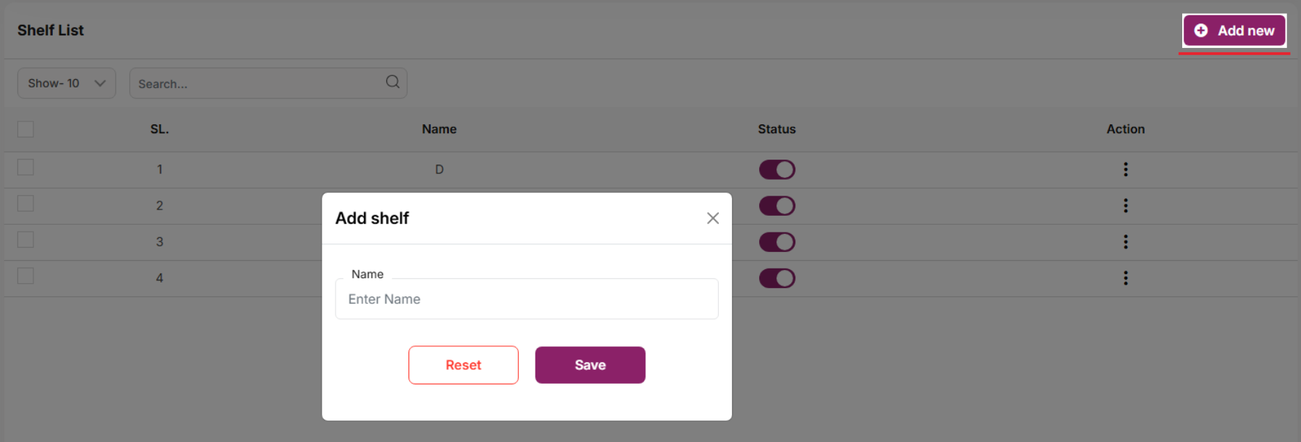 You can view the shelf list with available filtering options. Furthermore, you have the ability to edit, delete, or use the multi-delete function.