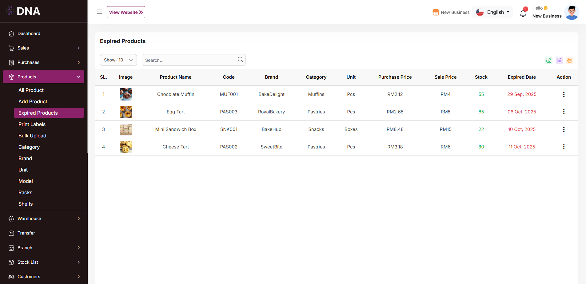 Here, you can view the expire Product list with filtering options available. The list can be exported as Excel, CSV, and there is also a print option. By clicking the "View" button, you can see details in a pop-up window.