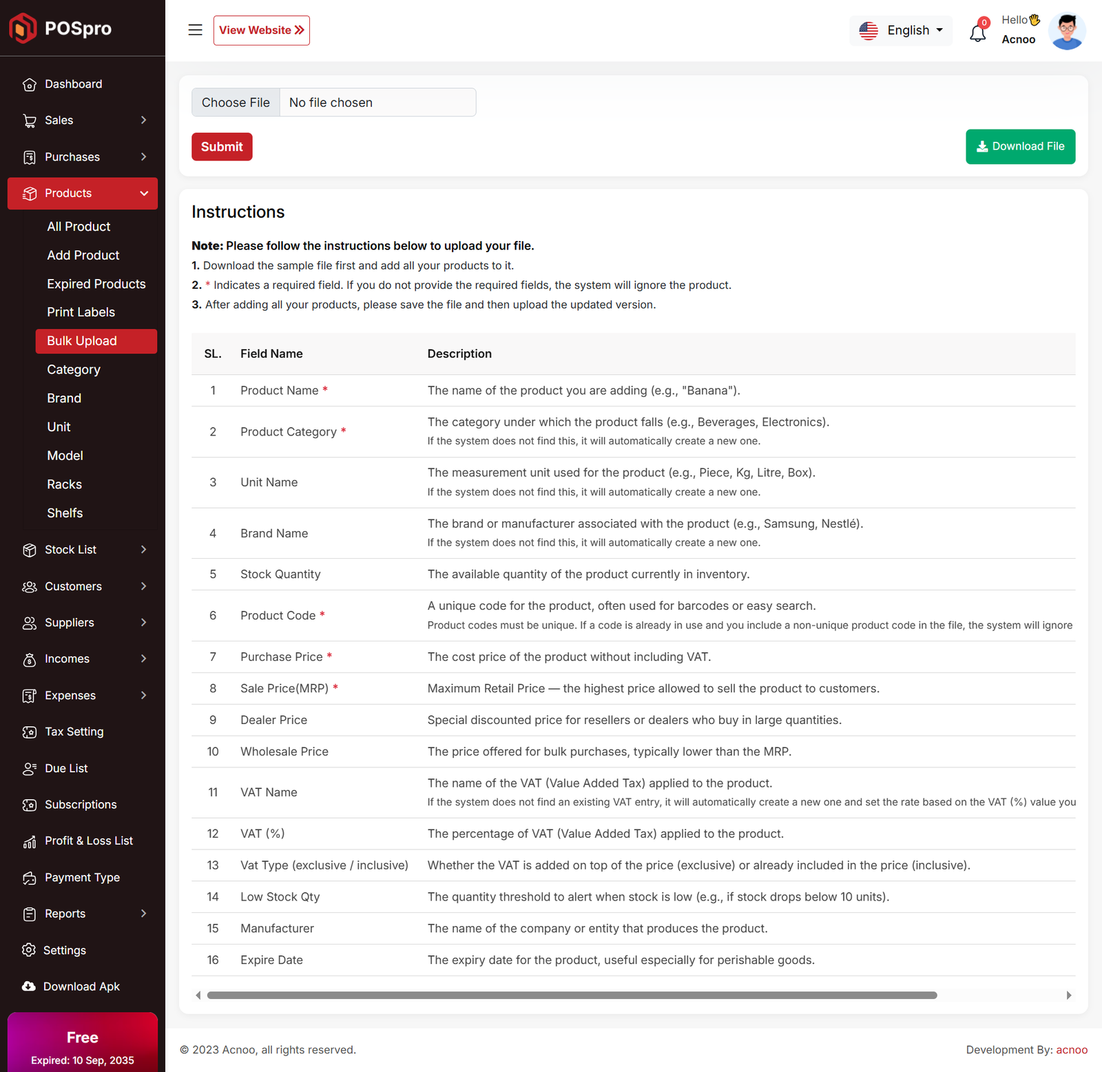 From the **Bulk Upload** module, users can upload a list of products in bulk. You can download a demo Excel file by clicking the download file button. This file contains all the columns that need to be filled, and columns marked with an asterisk (*) indicate mandatory fields. After completing the file, use the **Choose File** option to select your edited file for bulk upload, then click the **Submit** button. All roles, conditions, and instructions are illustrated in the image below for better understanding.