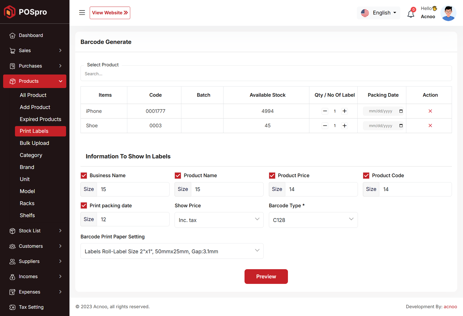 The Barcode Label Module in POS Pro allows users to generate and print barcode labels for selected products. Users can choose which information appears on the labels, including business name, product name, price, product code, packing date, and barcode. Each label uses the size defined for the product, and paper settings can be adjusted to ensure proper printing. Users can preview labels before printing to verify layout and content.