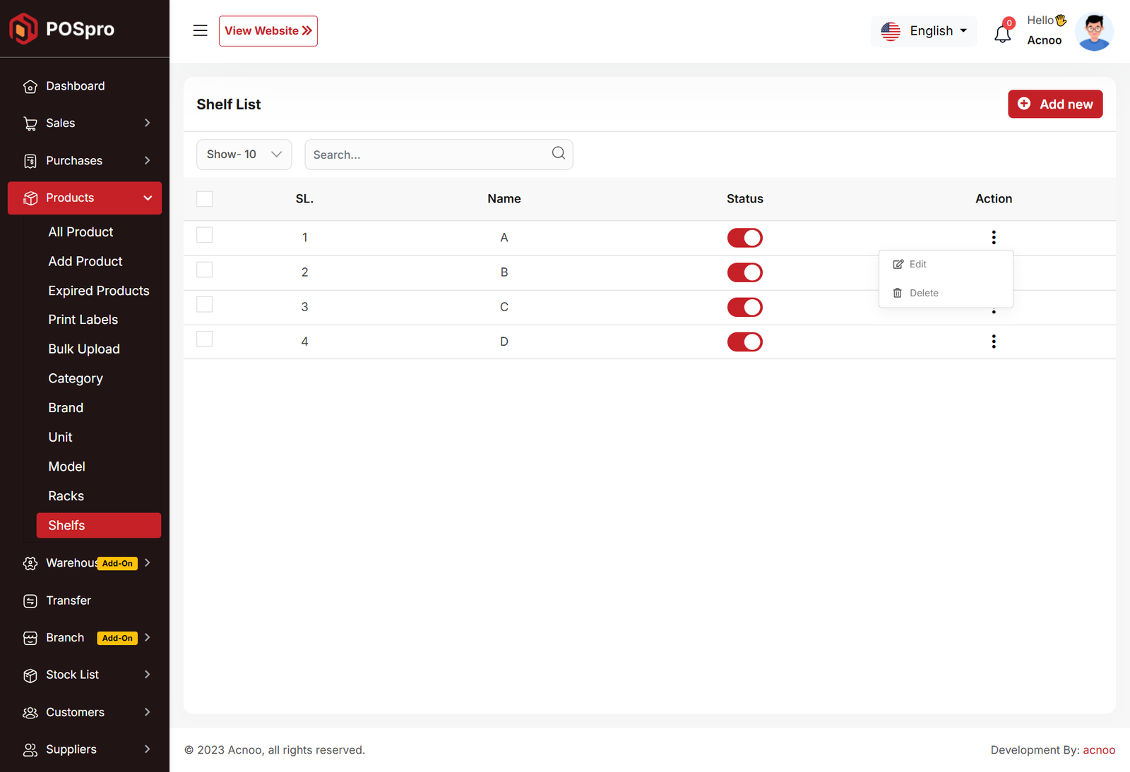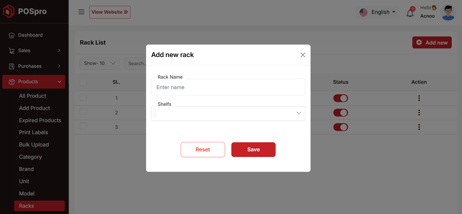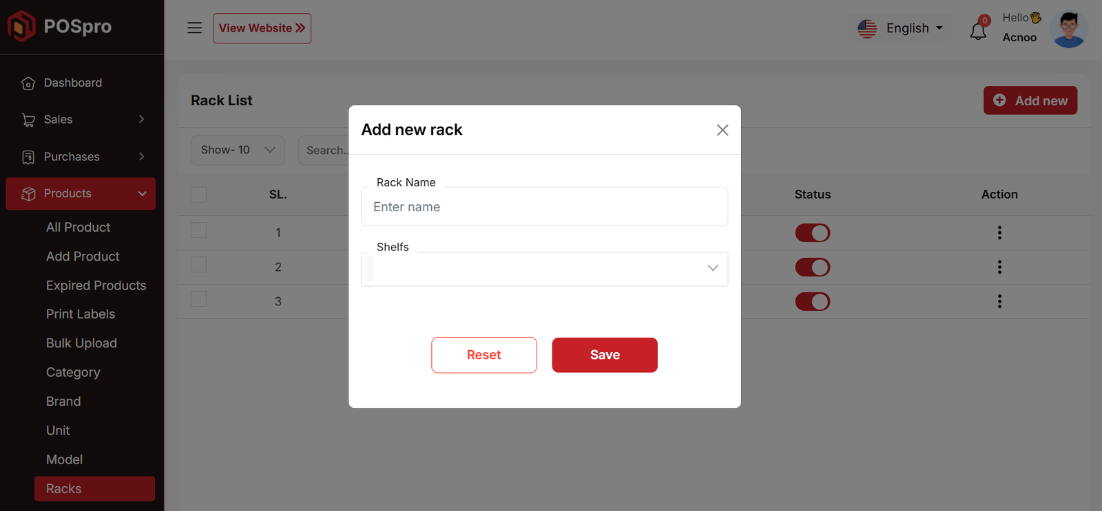 You can view the rack list with available filtering options. Furthermore, you have the ability to edit, delete, or use the multi-delete function.