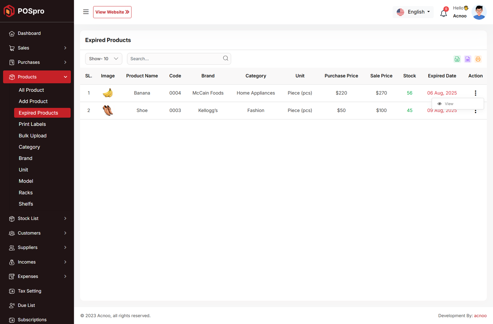 Here, you can view the expire Product list with filtering options available. The list can be exported as Excel, CSV, and there is also a print option. By clicking the "View" button, you can see details in a pop-up window.