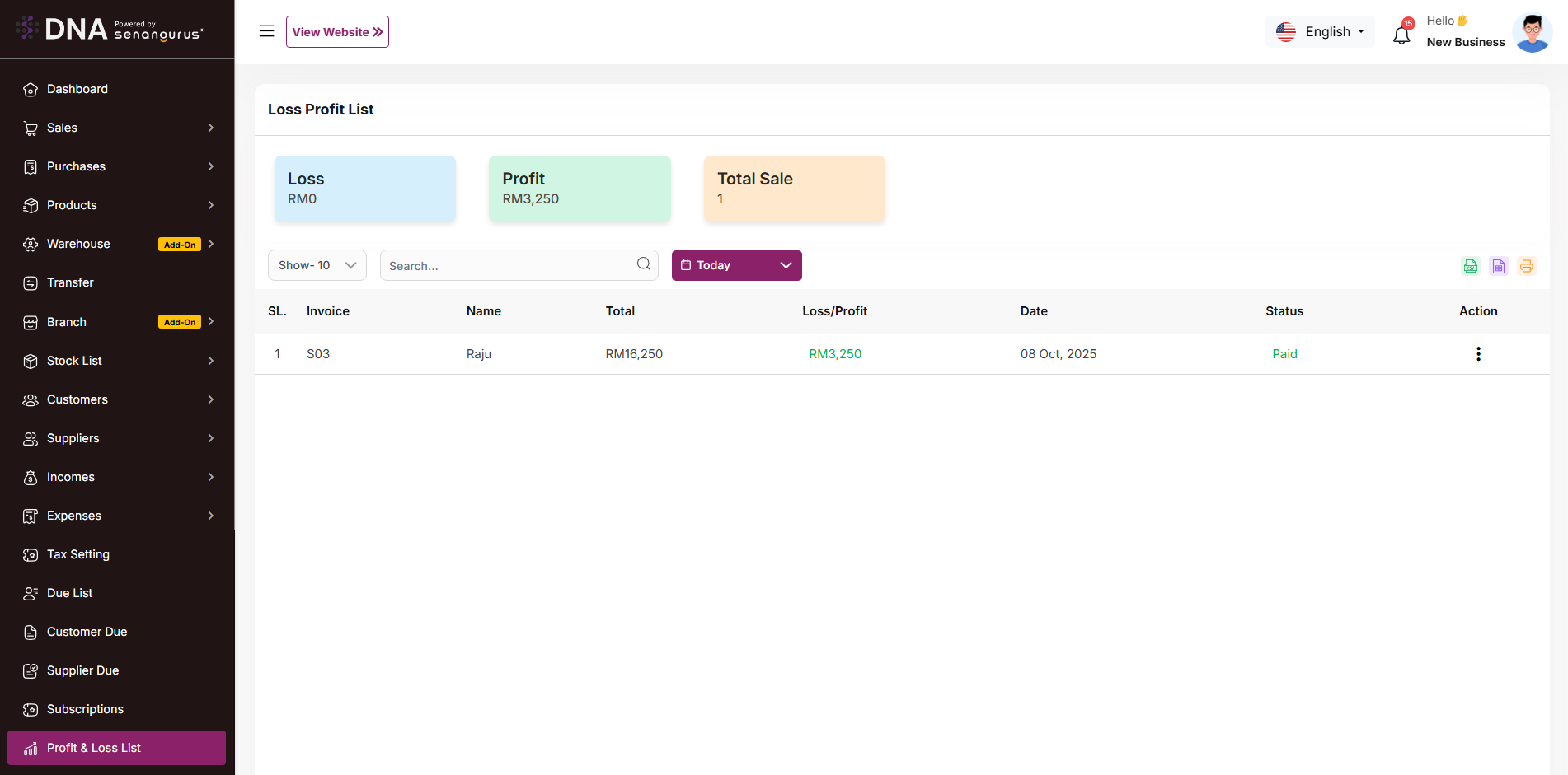 Here, you can view the profit and loss data from sales with search and date filters. You can also export the list as CSV, Excel, and print it. Additionally, the total loss and profit are displayed in the top cart.