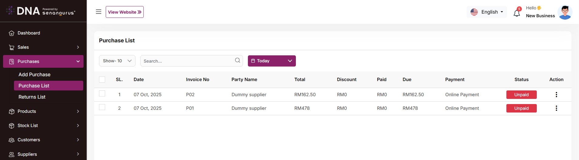 This appears to be a screenshot of the Purchase list page, where you can filter data using the search function. Additionally, you can view invoices, as well as edit, delete, or use the multi-delete option. Furthermore, you will have the option to initiate a Purchase Return from this list. Please note, once a Purchase return is processed, you will no longer be able to update or delete the Purchase.