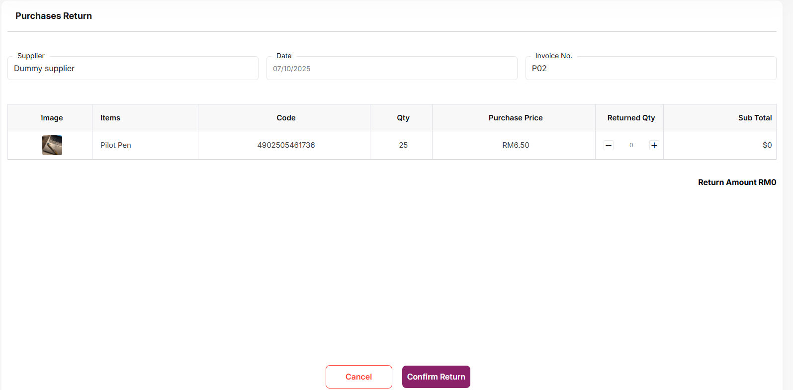 From the Purchase list, clicking on Purchases Return will open this page. You can adjust the quantity to return the desired amount, but you cannot return more than the purchased quantity.