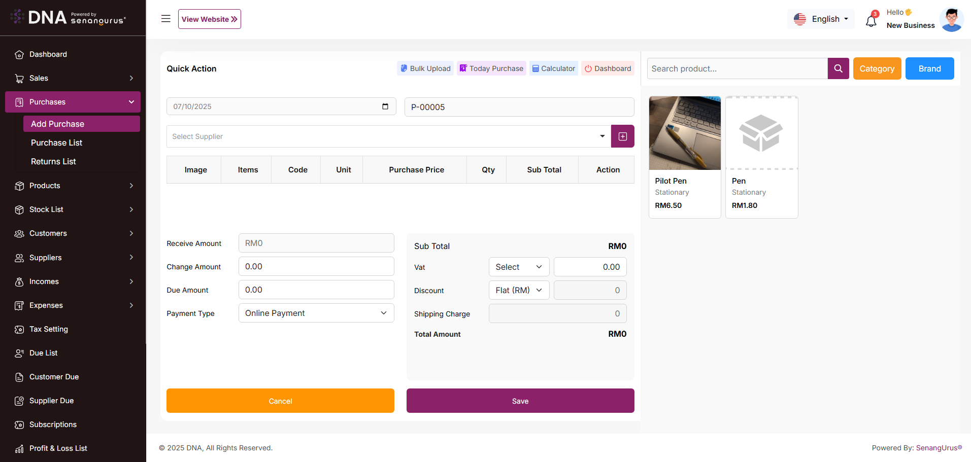 By clicking on "Add Purchase" you can create a new purchase. First, select a supplier. Next, choose a product for the purchase. Additionally, you can filter products by Category or Brand, using the same filters as in the Sale process.