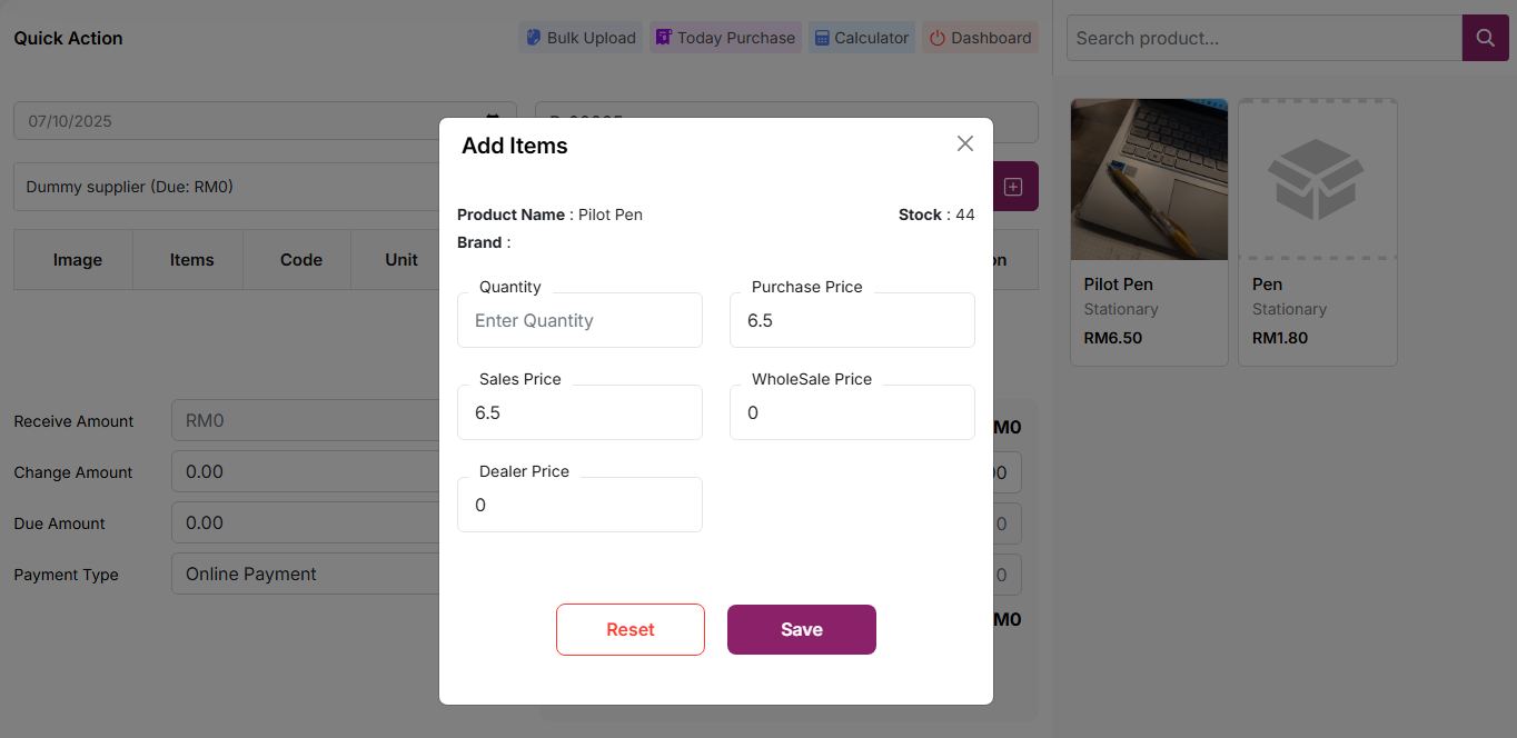 Next, select a product for the purchase. When you choose a product, a pop-up will appear. Enter the quantity you wish to purchase and update the prices as needed. Once done, click save.