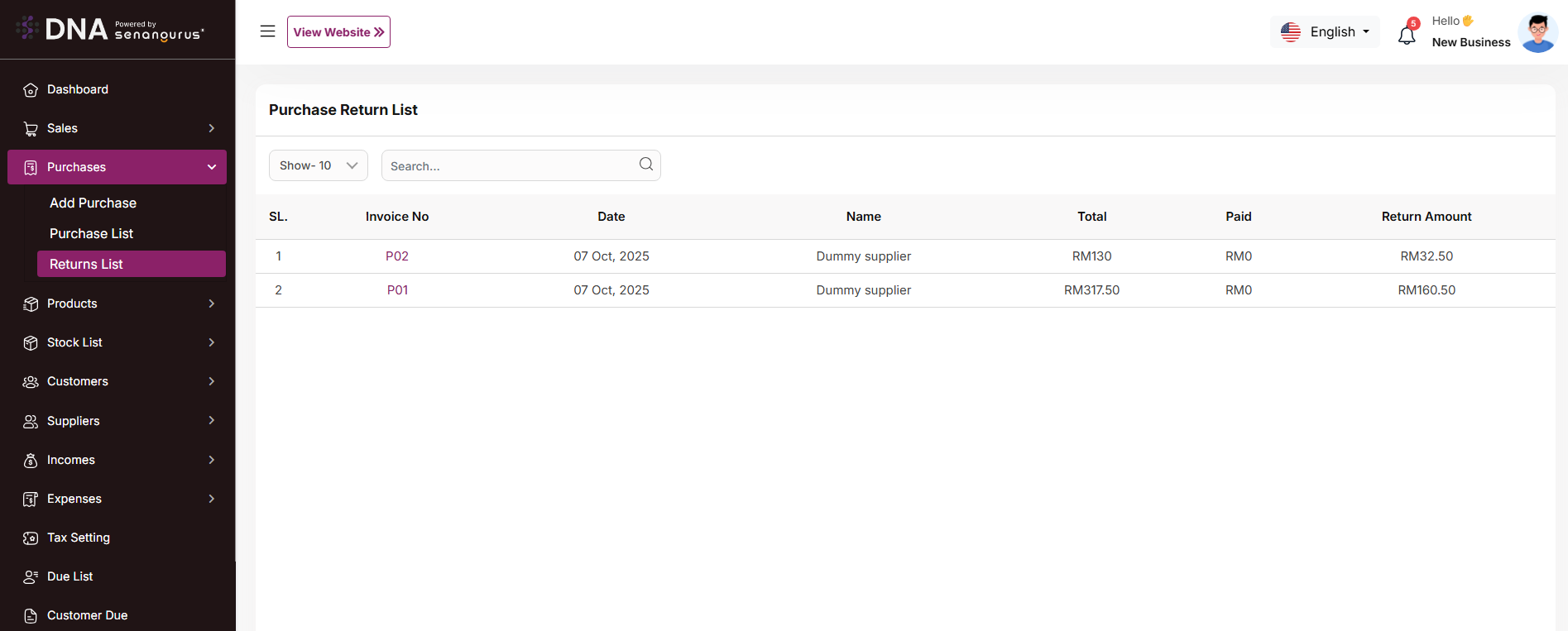 Here, you can view the complete list of Purchase returns with a filtering option. To view an invoice, simply click on the invoice No.